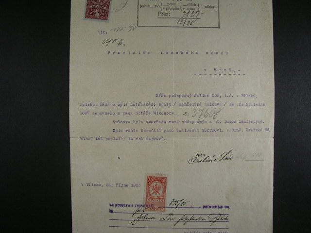 Kolky - uredni listina z r. 1925 se smis. frankaturou kolku CSR - Polsko