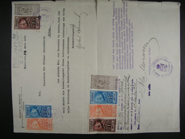 Kolky - Rumunsko - dve uredni listiny z r. 1924 a 1931 frank. pestrou frankaturou kolku