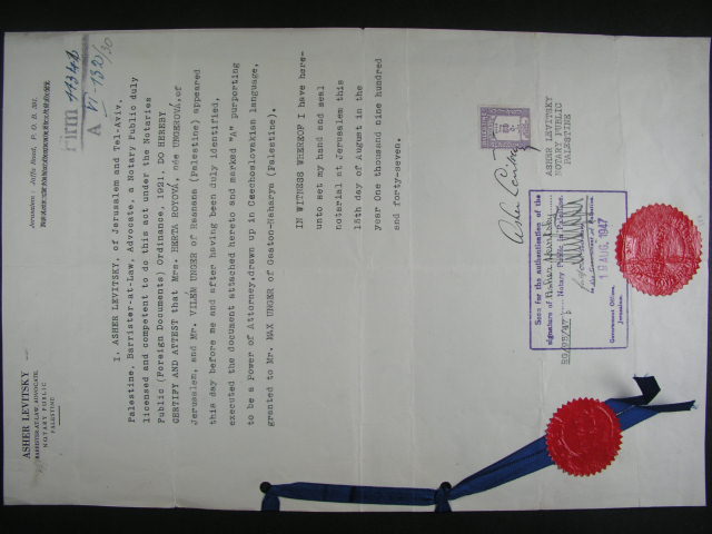 Kolky - dve uredni listiny z r. 1947 svazane modrou stuhou s cervenou papirovou peceti, dekorativni, zajimave s palestinskymi kolky