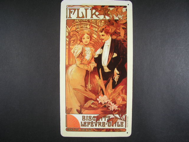 plechova tabulka s bar. reprodukci Muchova plakatu "FLIRT" z r. 1900, reprodukci vydal MUCHA TRUST 2002