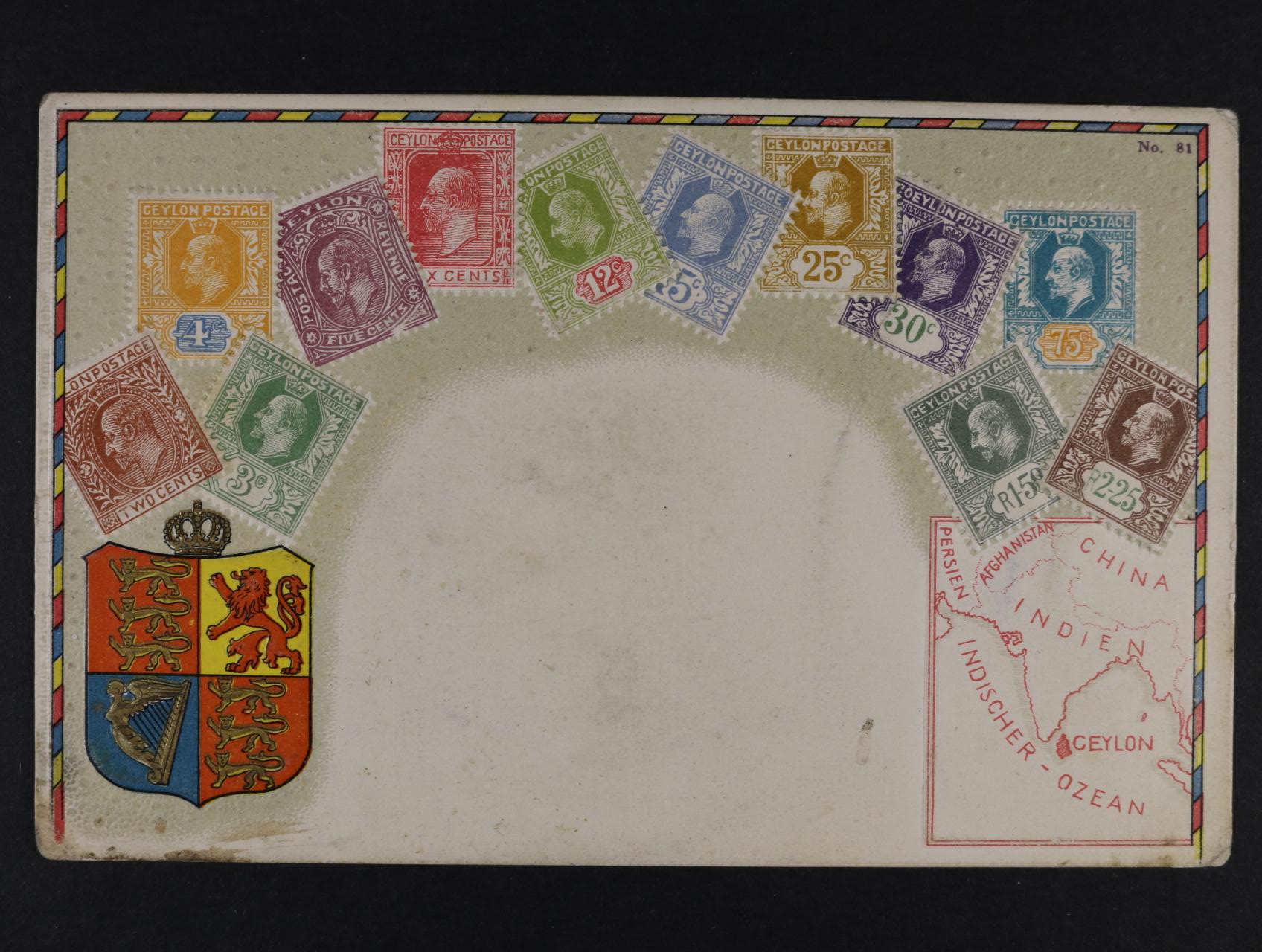 1152 Známky - bar. reliéfní litograf. koláž se zn. Ceylonu, dl. adresa, nepoužitá 200