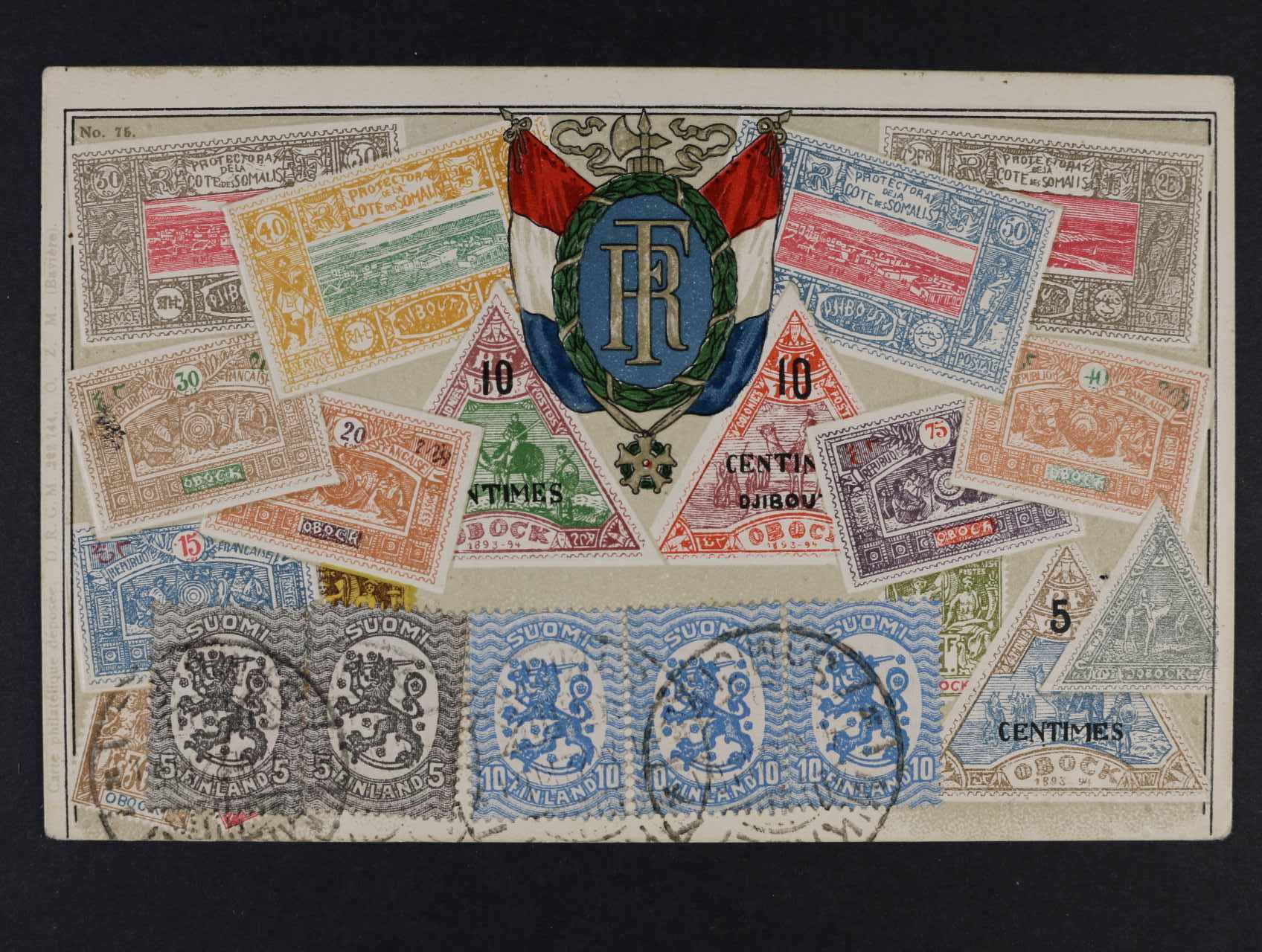 1153 Známky - bar. reliéfní litograf. koláž se zn. franc. kolonie OBOCK, použitá 250