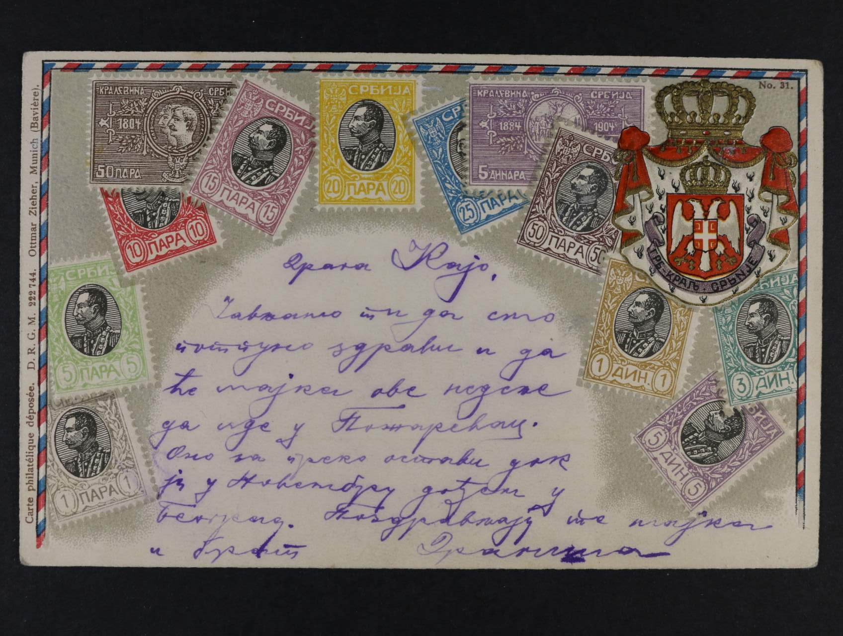 1154 Známky - bar. reliéfní litograf. koláž se zn. Srbska, dl. adresa, použitá 1905, na zadní straně stržená zn. 200