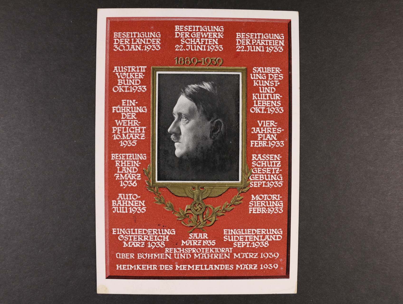 1159 Bar. pohlednice 50. narozeny A.H., čb. portrét, okolo text, pod. raz. PRAHA 21.4.39, pam. raz. PRAHA1 50. VÝROČÍ NAROZENIN VŮDCE 20.4.1939 400