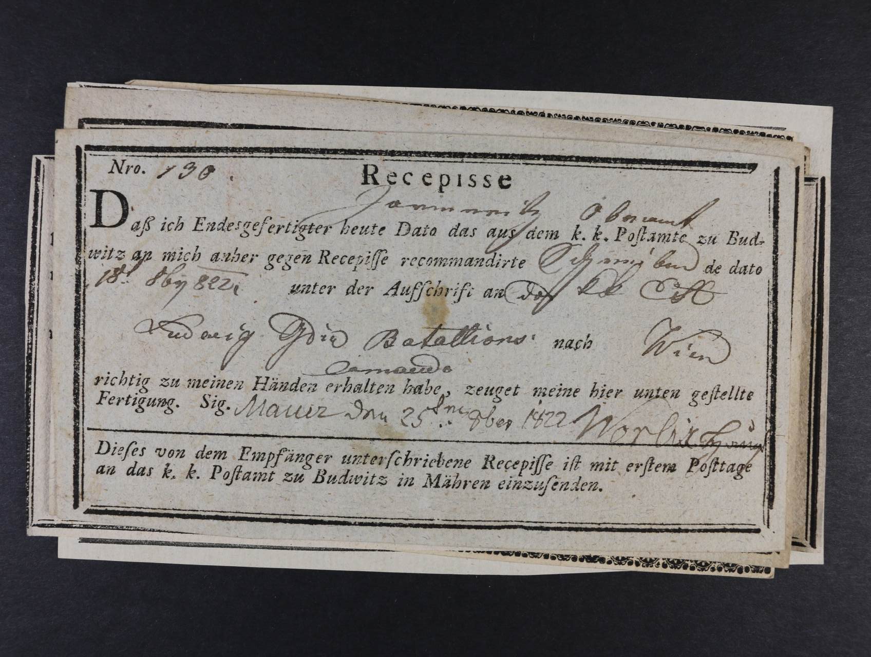 sestava 18 ks různých zpátečních recepisů z Mor. Budějovic z let 1822 - 44, zajímavé