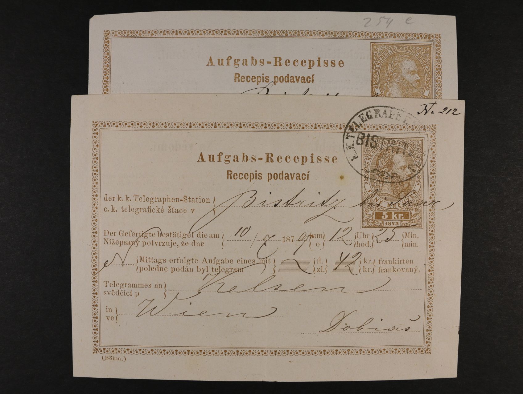 dva podací recepisy na telegram - 1x znehodnoc. ručně 31.7.1874, 1x s oválným raz. TELEGRAPHEN ... BISTRIZ 10.7.1879, dobrá kvalita