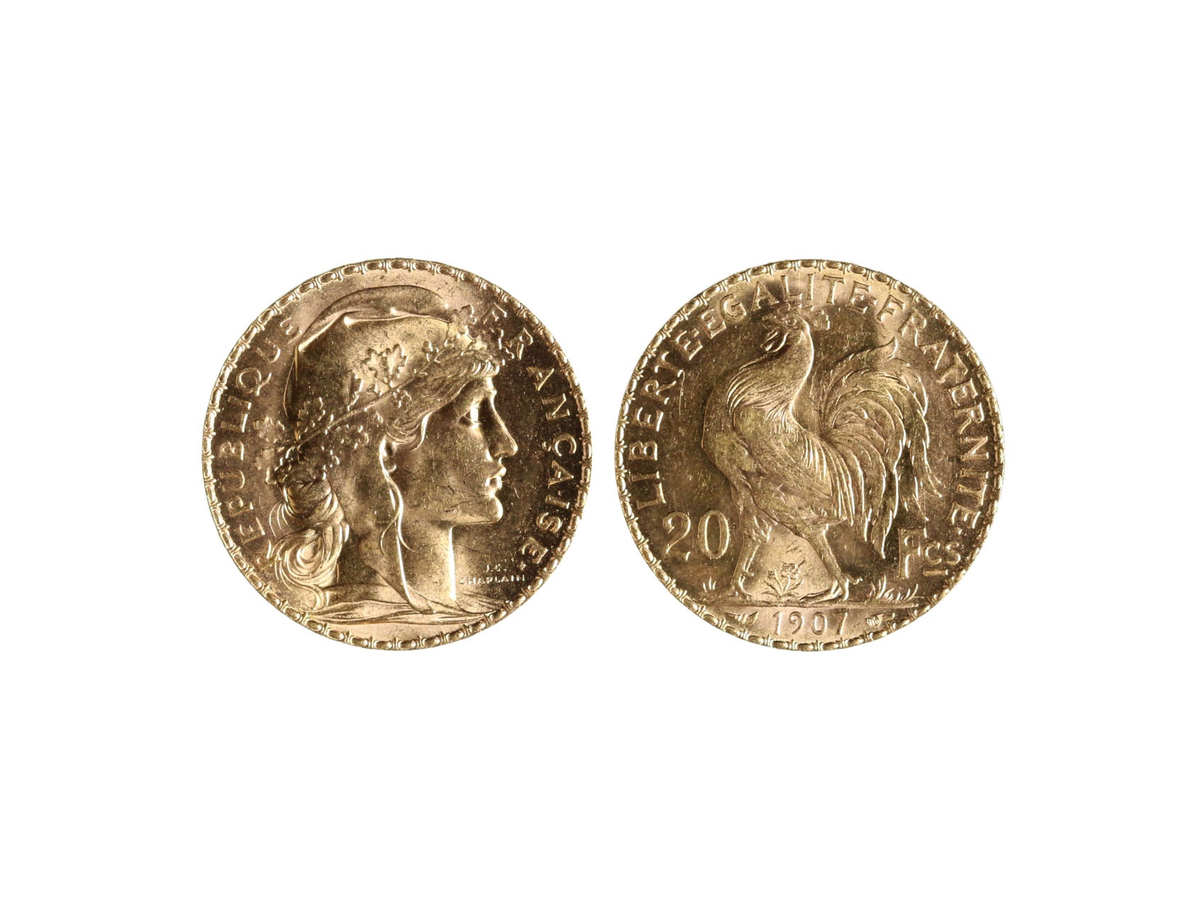 Francie - 20 Frank 1907 kohout, 6,451g, Au 0,900