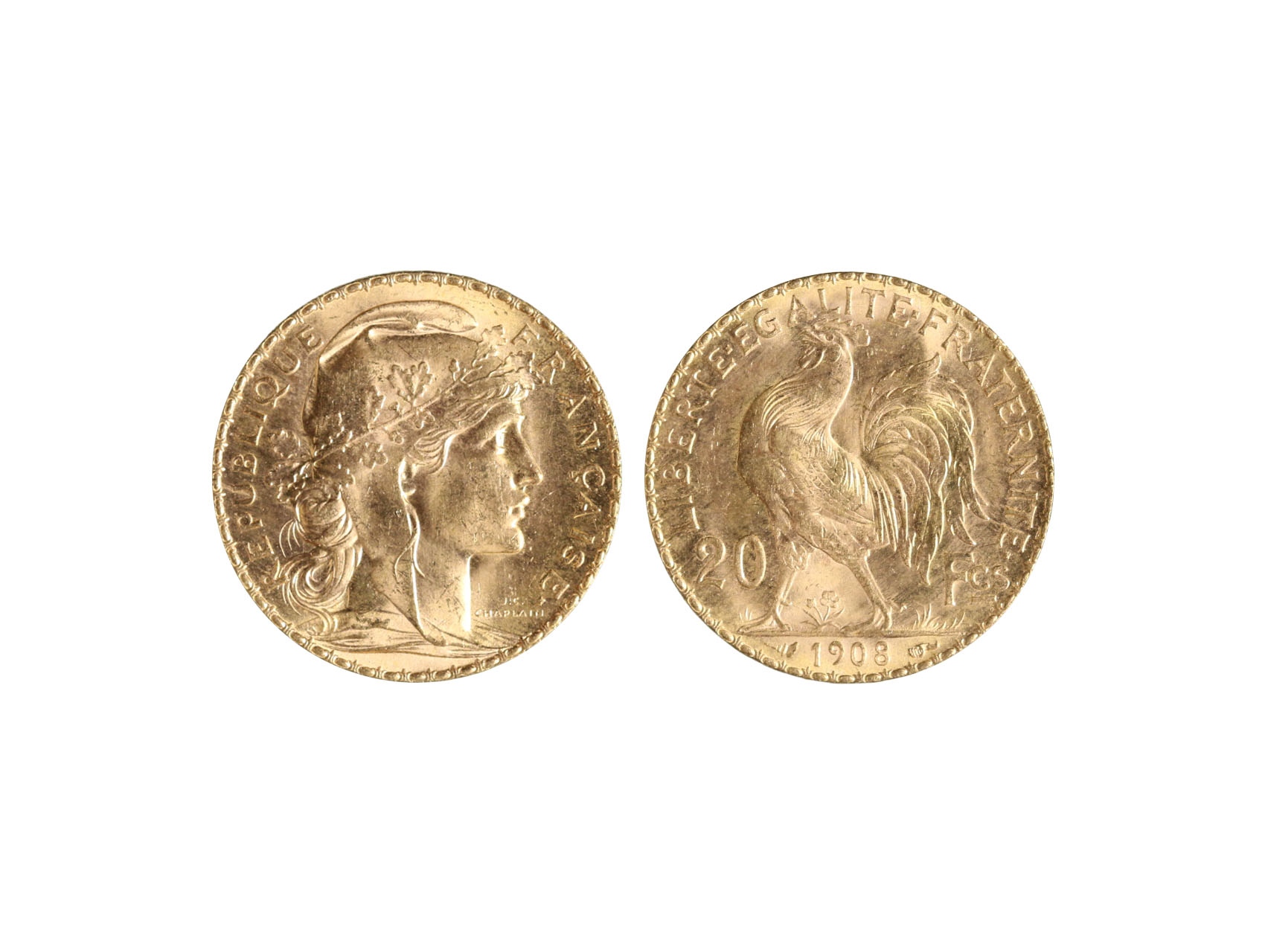 Francie - 20 Frank 1908 kohout, 6,451g, Au 0,900