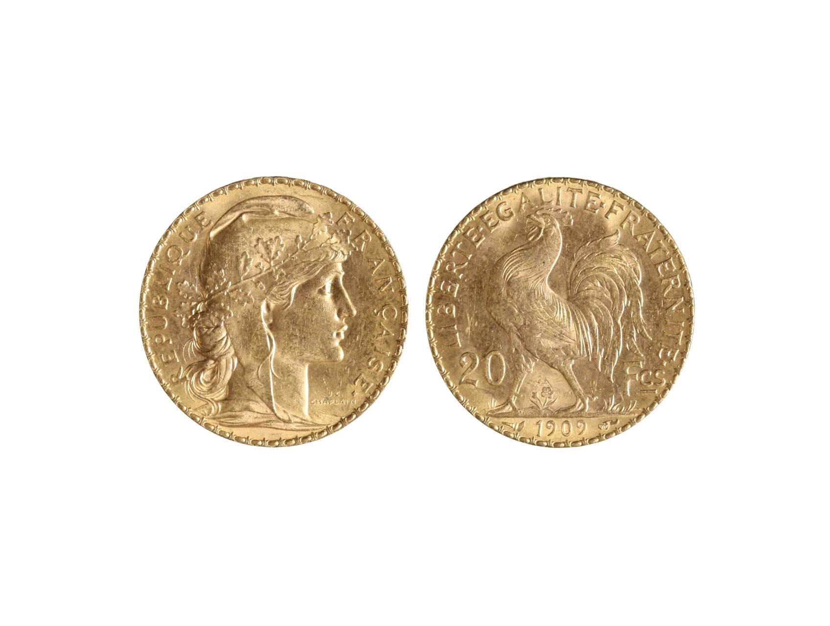 Francie - 20 Frank 1909 kohout, 6,451g, Au 0,900