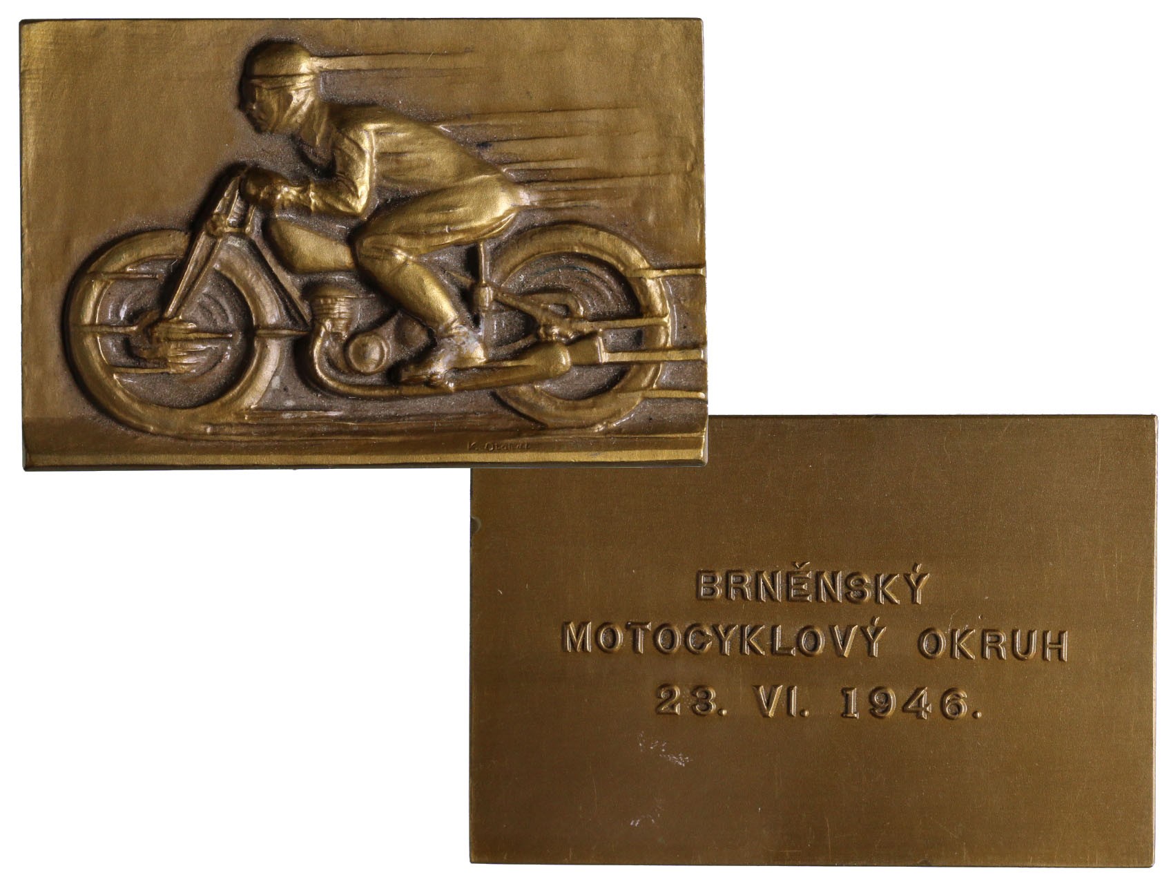 Motorismus - Československo, AE medaile, Motocyklista na motocyklu/ text Brněnský motocyklový okruh 23. VI. 1946, rozměry 44x67 mm