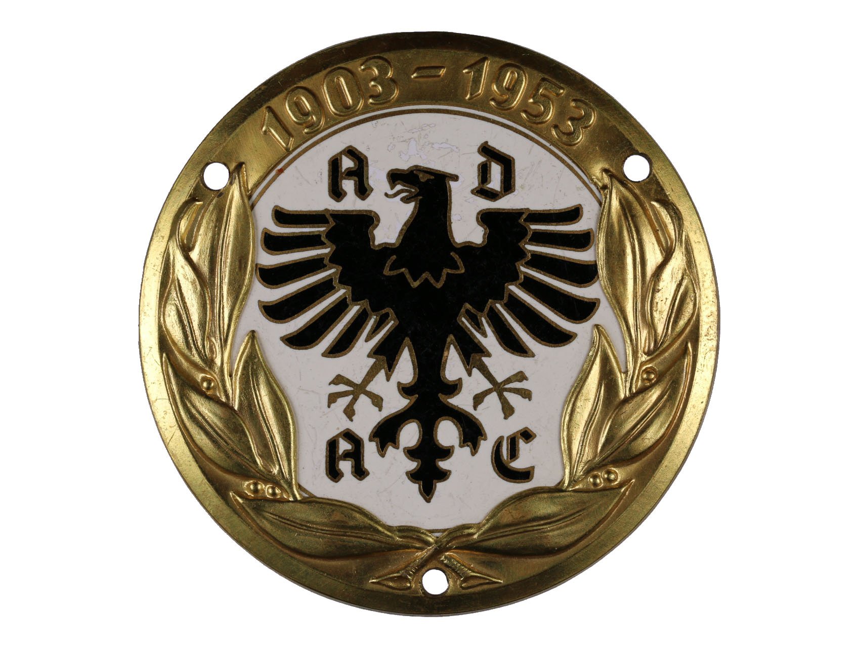 Motorismus - Německo, smaltovaná plaketa ADAC 1903-1953, tři otvory pro uchycení na chladič, na reversu značka výrobce, průměr 90 mm