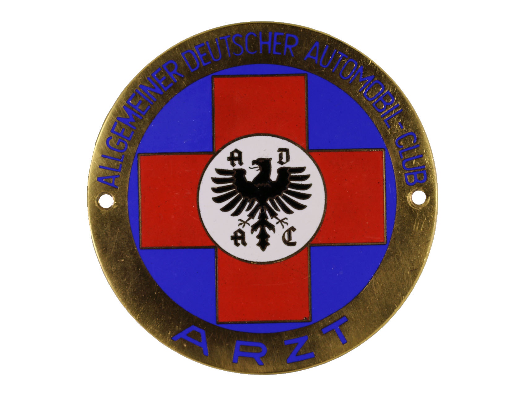 Motorismus - Německo, smaltovaná plaketa ADAC, lékař, dva otvory pro uchycení na chladič, průměr 90 mm