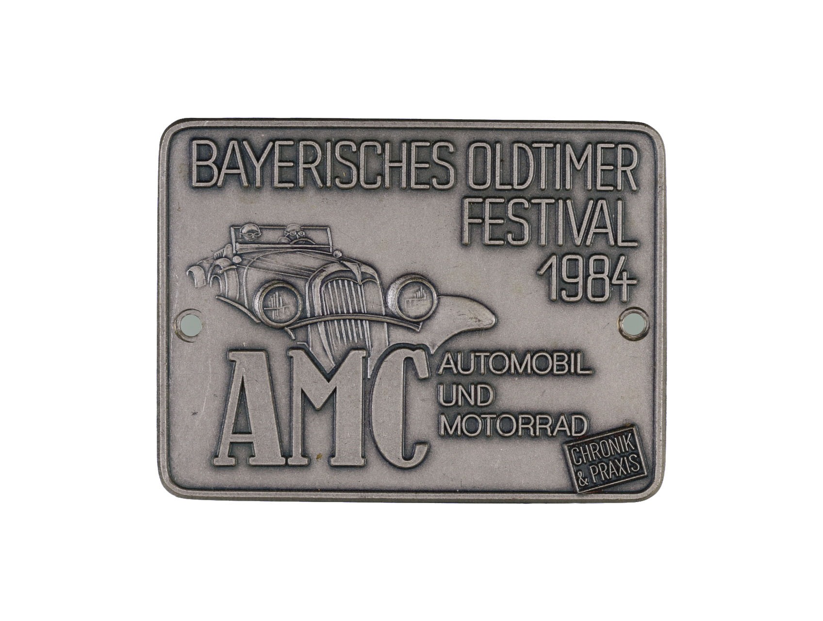 Motorismus - Německo, plaketa AMC BAYERISCHES OLDTIMER FESTIVAL 1984, dva otvory pro uchycení na chladič, na reversu značka výrobce, rozměry 54x72,5 mm