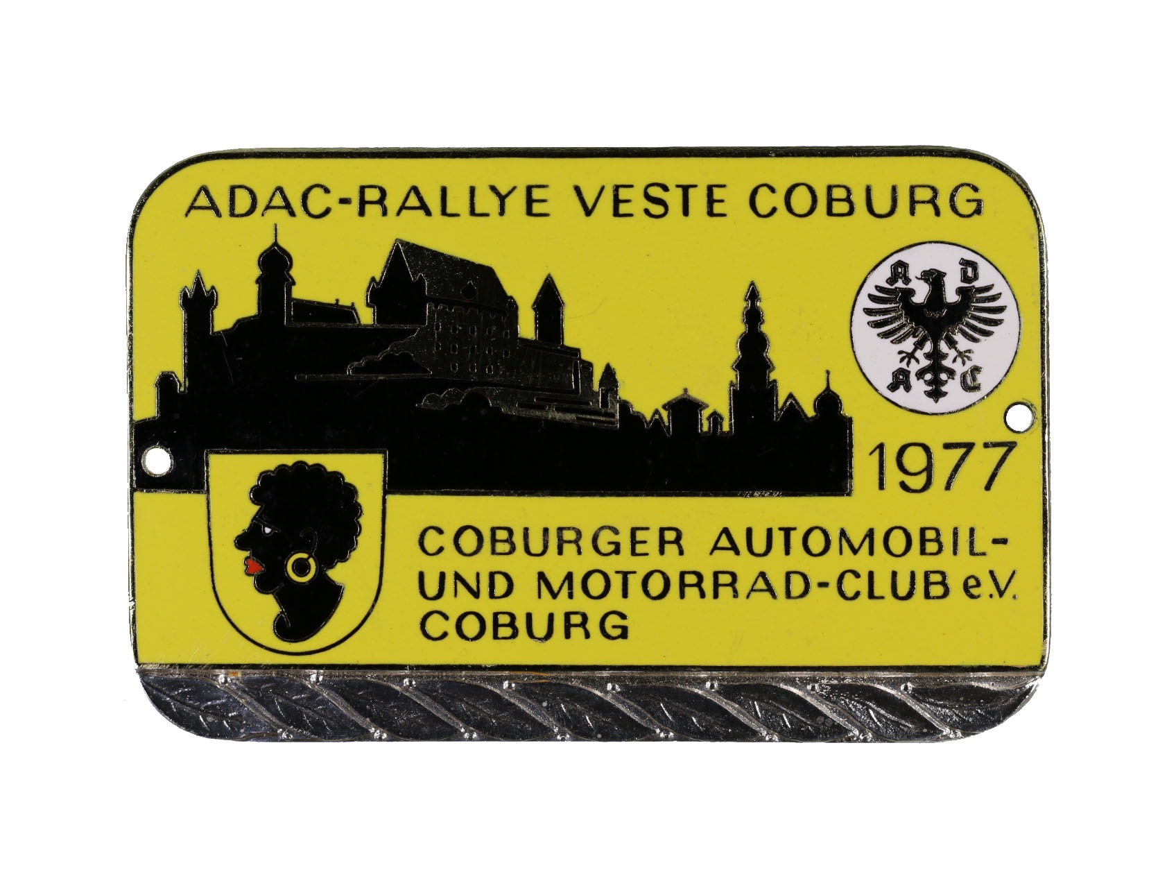 Motorismus - Německo, smaltovaná plaketa ADAC RALLYE VESTE COBURG 1977, dva otvory pro uchycení na chladič, rozměry 70x109,6 mm