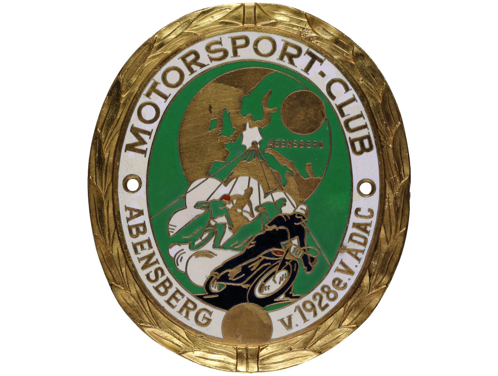 Motorismus - Německo, smaltovaná plaketa MOTORSPORT-CLUB ABENSBERG, dva otvory pro uchycení na chladič, ovál 104x90 mm