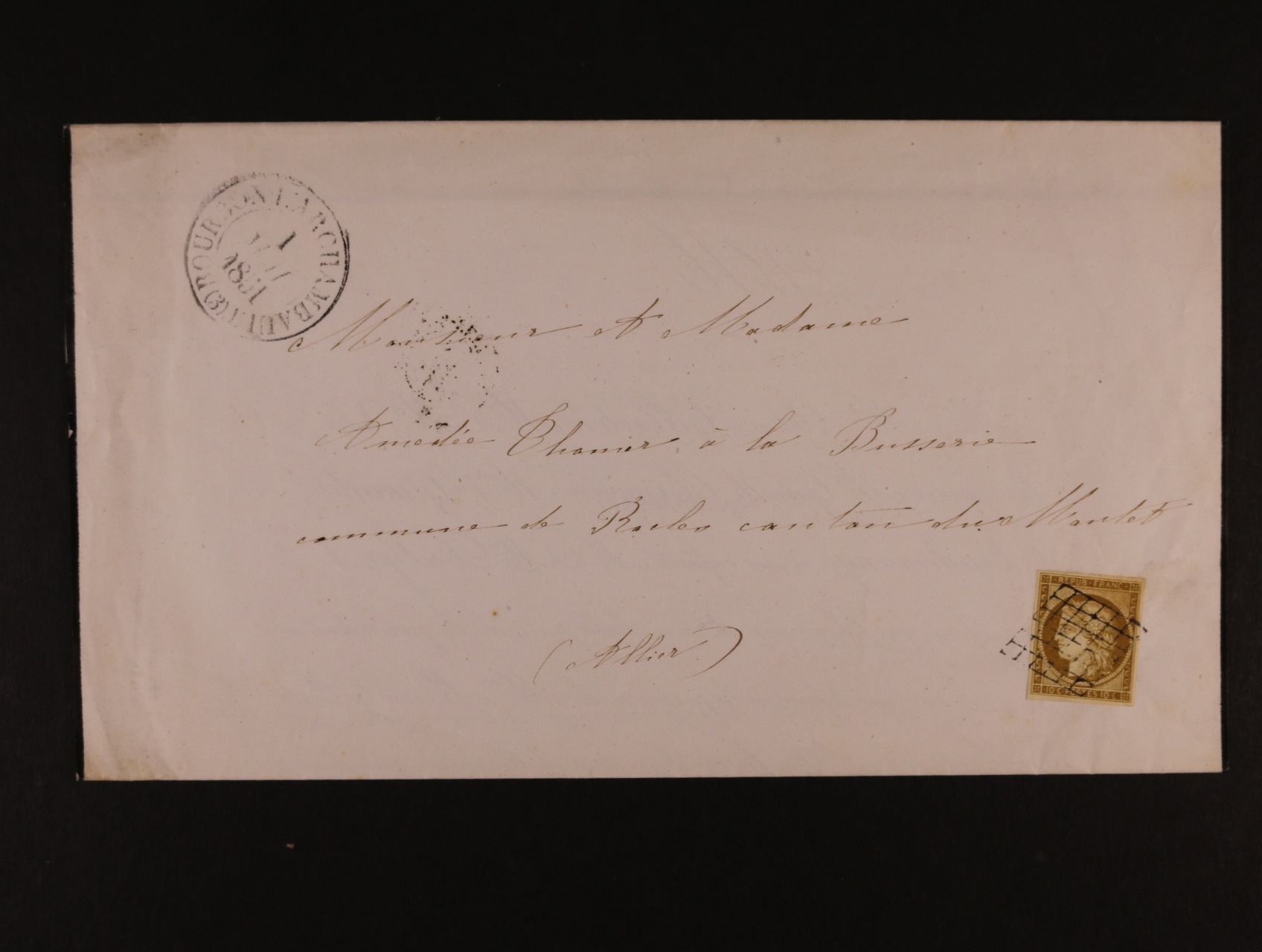 skl. dopis z r. 1851 frank. zn. Mi. č. 1 Ceres 10C, luxusní střih, lehké podací němé razítko + denní raz. BOURBONN ARCHAMBAUI 1.JULI 1851, + průch a přích. raz.