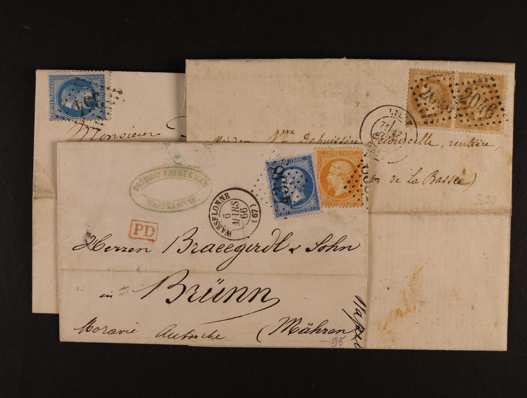 skl. dopis malého formátu z r. 1867 frank. zn. Mi. č. 21 - 22, znehodnoc. čís. raz. 4338 + denní raz. WASSFLONNE 6.MARS, skl. dopis frank. zn. Mi. č. 27 ve vodorovné dvoupásce, znehodnoc. čís. raz. 2046 + denní raz. LILLE 17.JUL. a skl. dopis frank. zn. Mi. č. 28 znehodnoc. čís. raz. 354 + denní raz. BAVAY 23.JNV.1869 + přích. raz.
