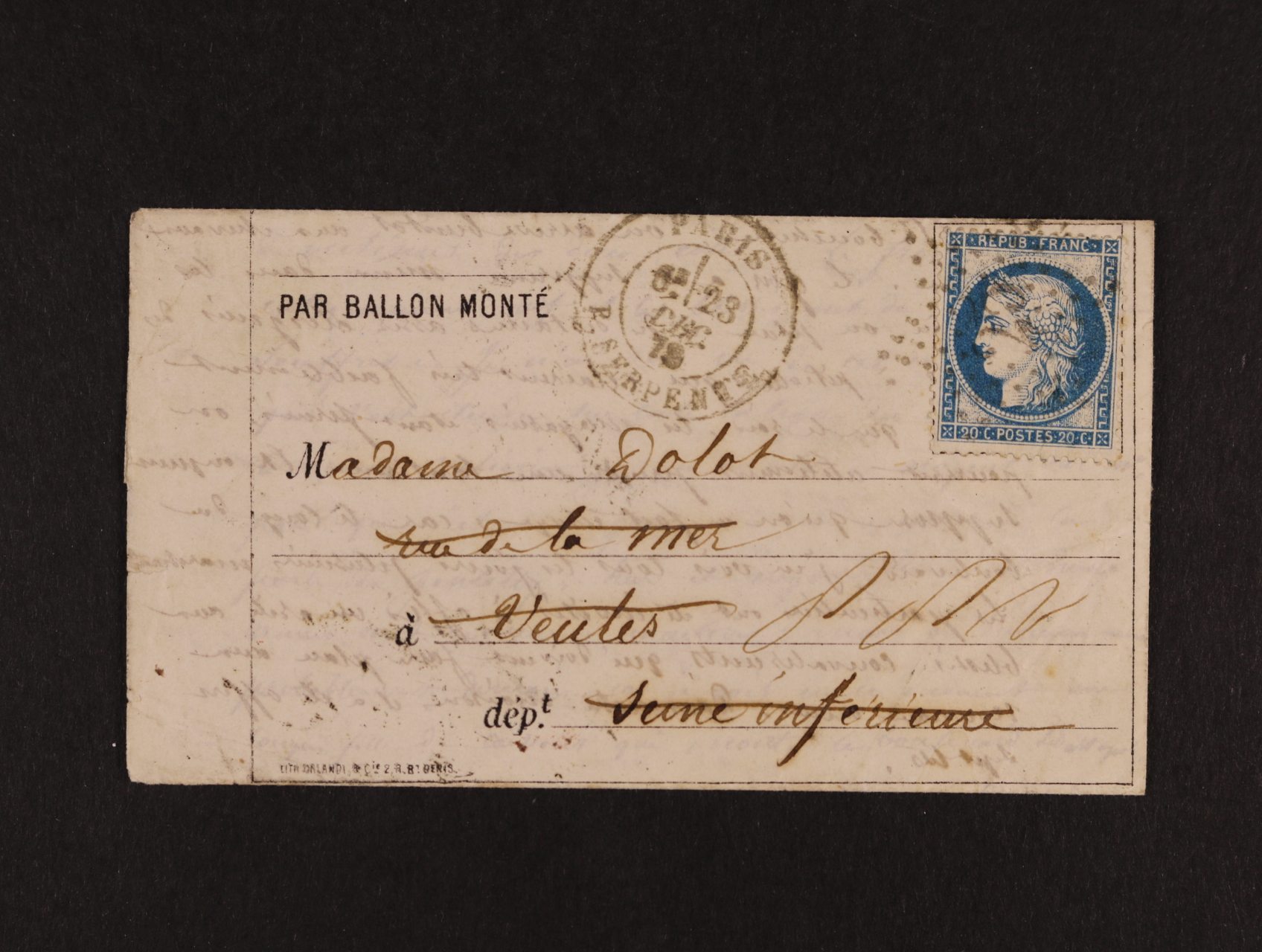 skl. dopis malého formátu z r. 1870 přepr. balonovým letem, frank. zn. 20c Ceres, pod. raz. PARIS P. SERPENO 23.DEC. 1870, průch. a přích. raz., dobrá kvalita, velmi zajímavé