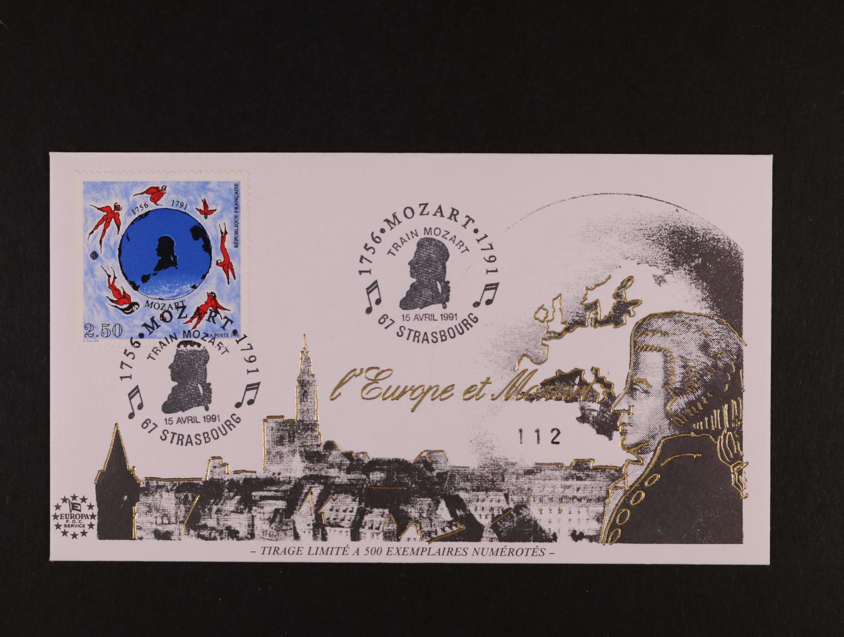 příležitostná obálka vydaná v r. 1991 k mozartovskému výročí, tyto obálky byly určeny pro oficiální reprezenraci evropských institucí ve Štrasburku, vydáno 500 čísl. kusů, tato obálka s čís. 112 pochází z pozůstalosti velvyslance Dr. Čestmíra Císaře