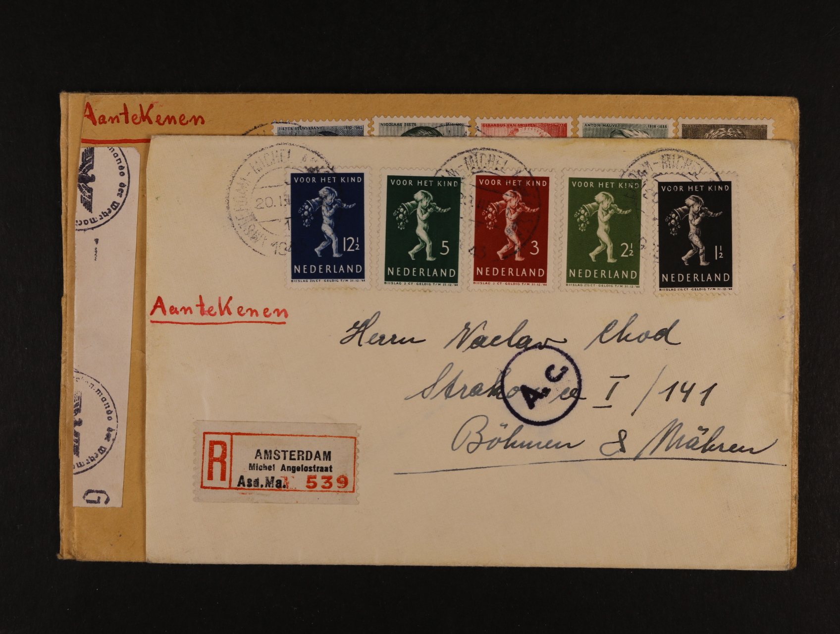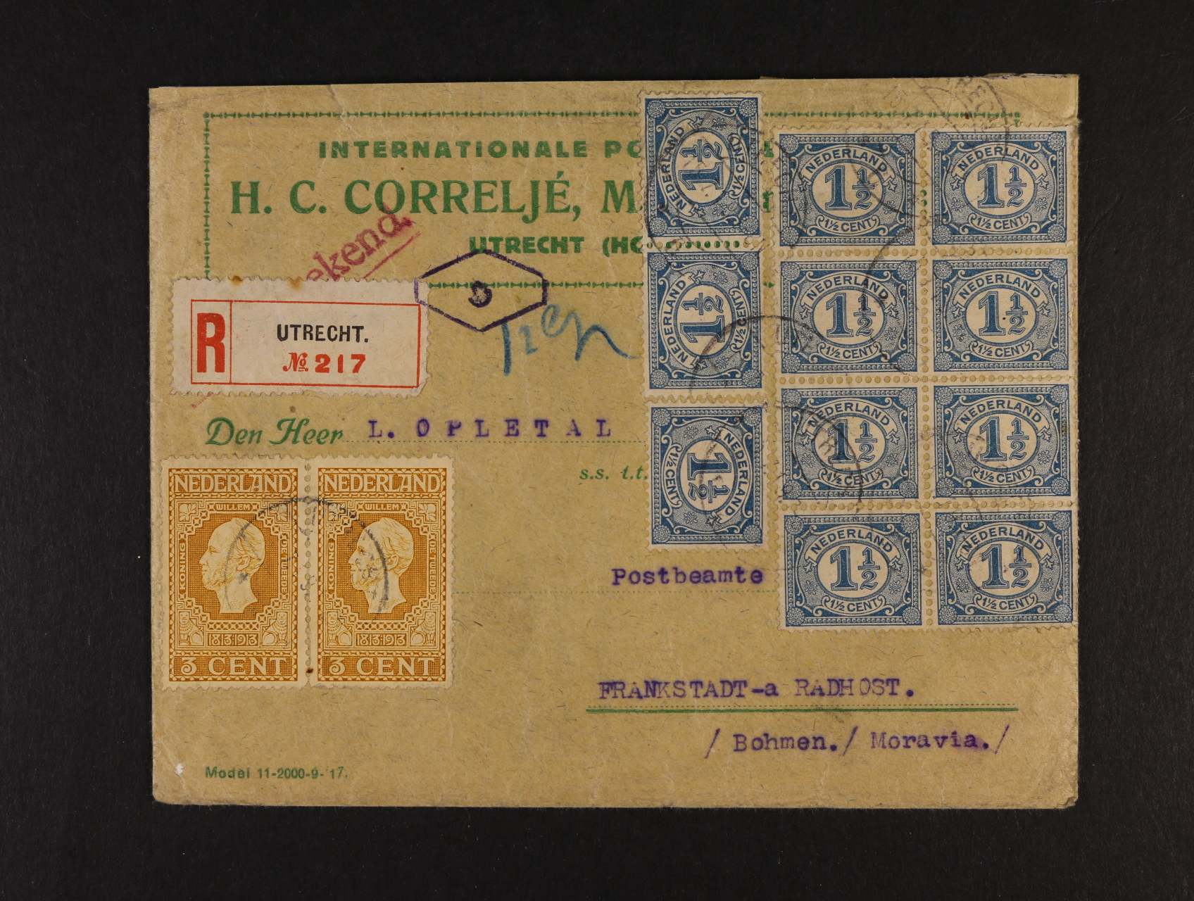 firemní R-dopis do ČSR frank. mj. zn. Mi. č. 82, pod. raz. UTRECHT 15.7.19, na zadní str. zálepka pošty v Utrechtu