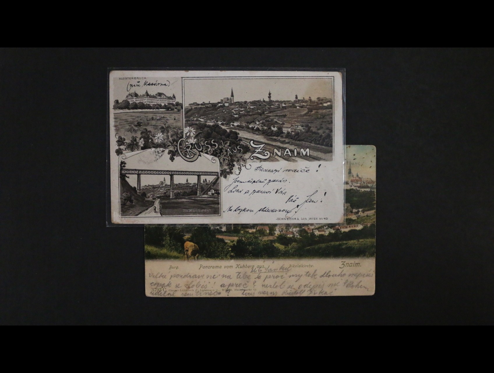 Znojmo - bar. a jednobar. litografie, dl. adresy, použité 1897 a 1901, zajímavé
