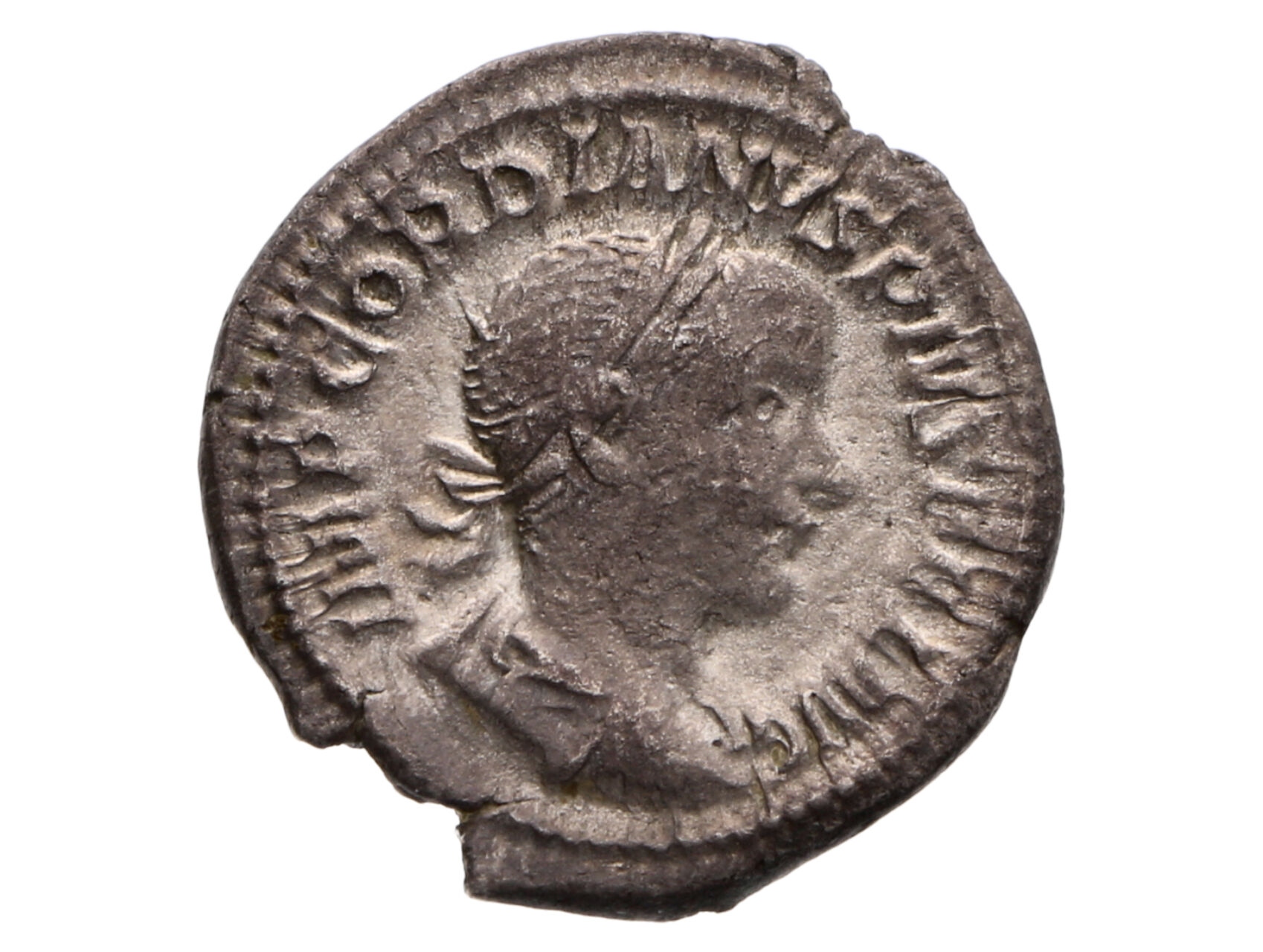 Řím císařství, Gordianus III. 238-244 - AR Denár. Ověnčená hlava panovníka zprava, IMP GORDIANVS PIVS AVG / Gordian na koni vlevo, pravou ruku zvednutou na pozdrav, v levé drží žezlo, P M TR P III COS P P. 2,87 g., RIC 81, KAMP 72.35.4