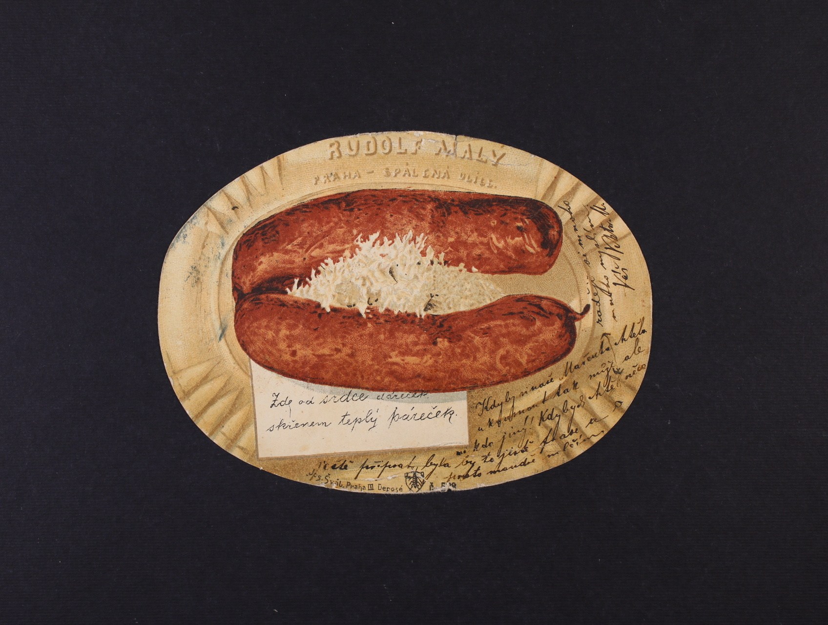 Reklamní - bar. litograf. koláž ve tvaru talíře, dl. adresa, použitá 1902