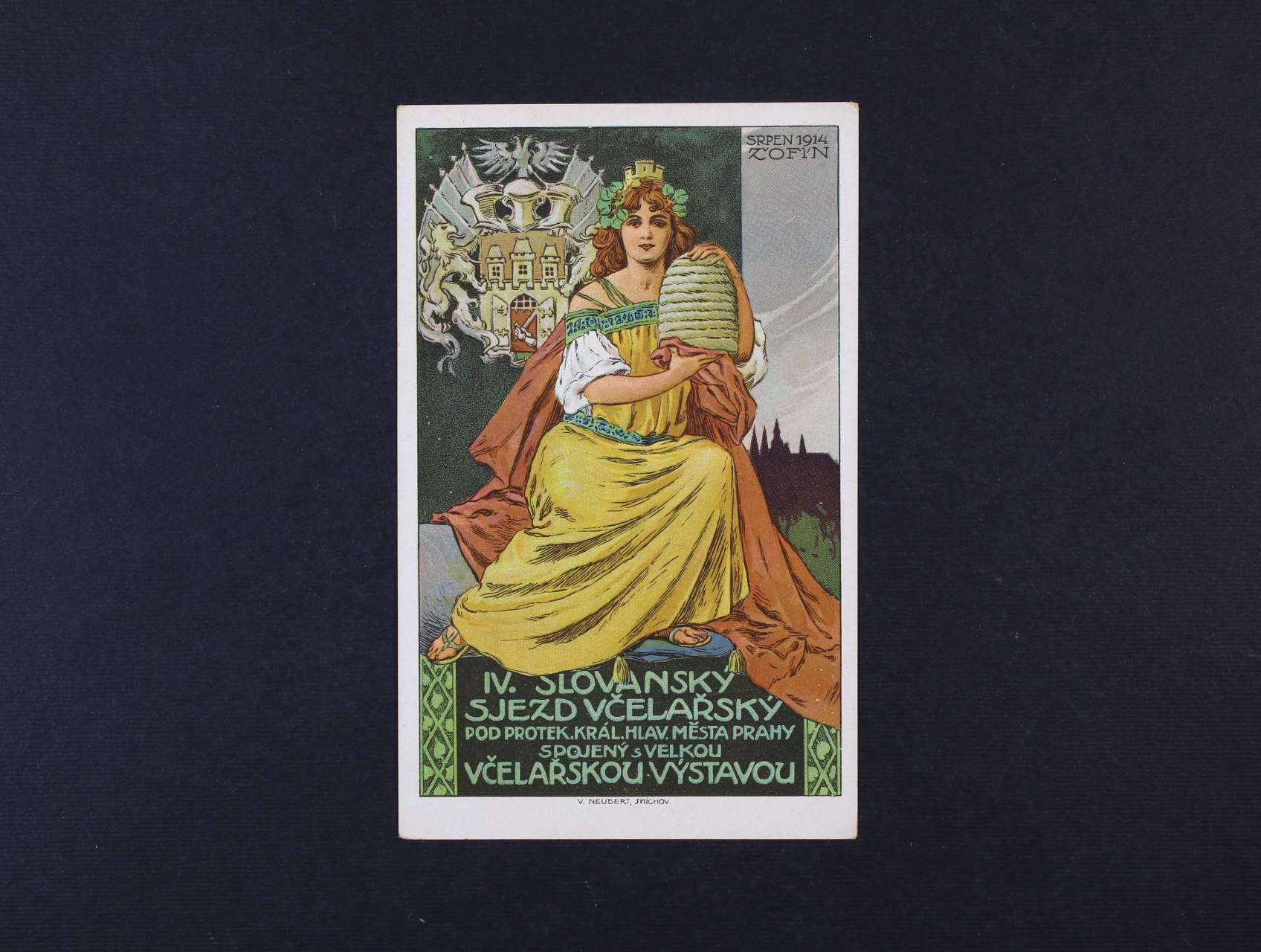 Sjezdy a výstavy - bar. litograf. koláž IV. Slovanský sjezd včelařský Žofín 1914, nepoužitá