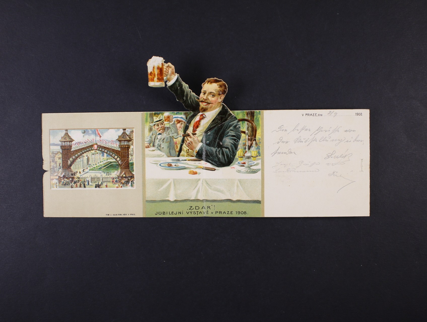 Sjezdy a výstavy - dvoudílná bar. litograf. koláž se skládačkou ZDAR JUBILEJNÍ VÝSTAVĚ V PRAZE 1908