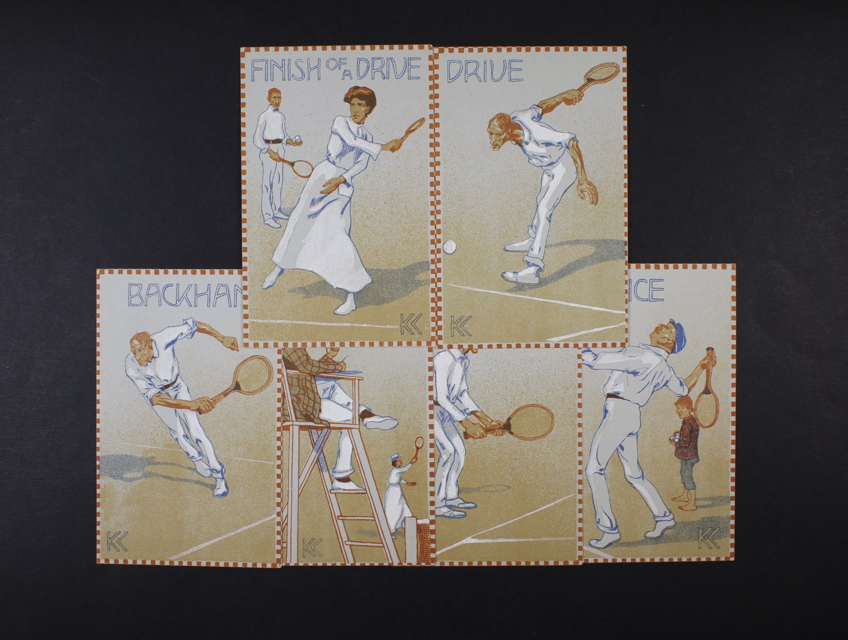 Sport - sestava 6 ks bar. litograf. pohlednic s námětem tenis, signatura KC (Rakousko), nepoužité