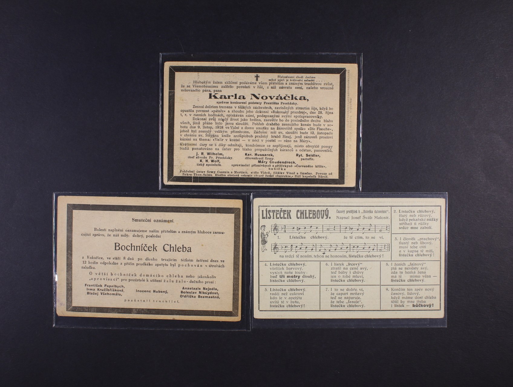 Švábova časová dopisnice č. 2225 "Lísteček chlebový", dtto "Bochniček chleba", dtto č. 306 "parte Karla Nováčka, nepoužité