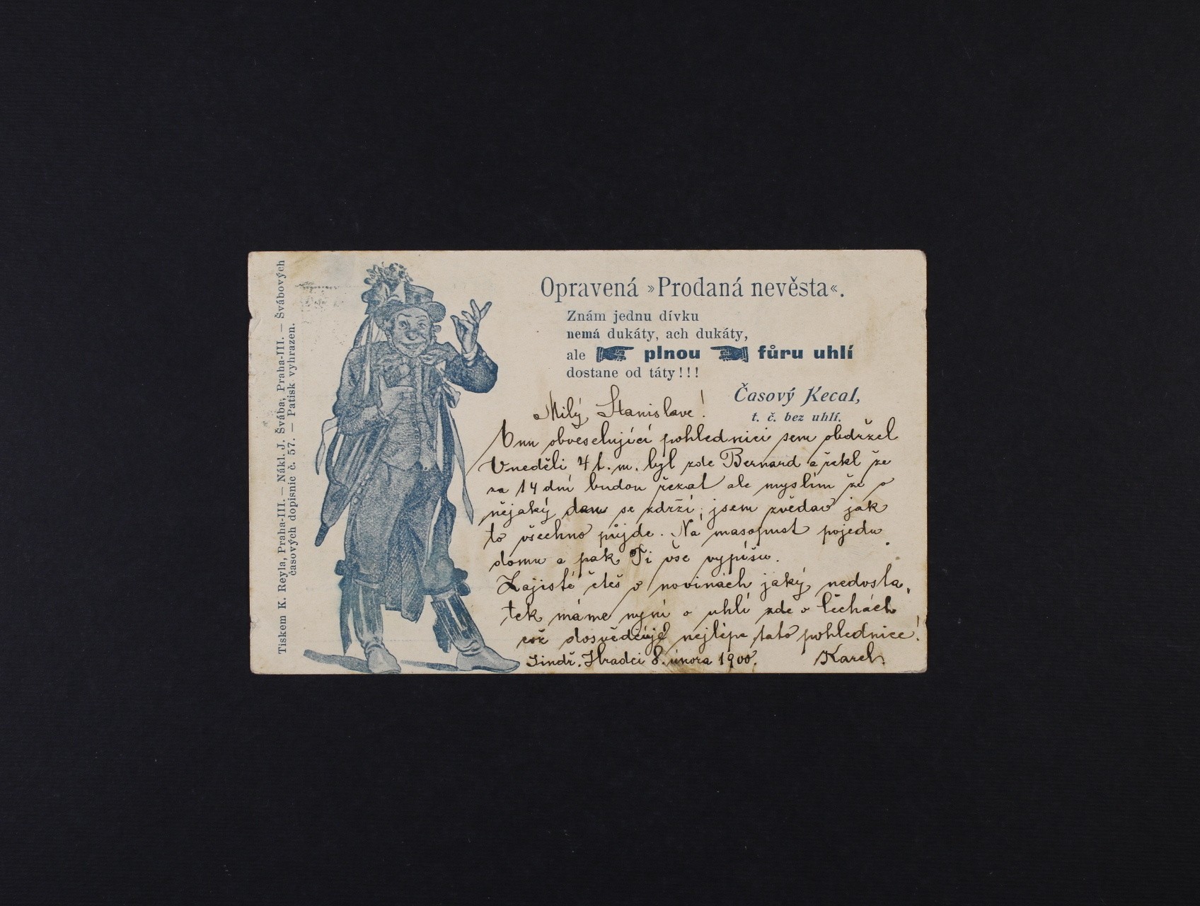 Švábova časová dopisnice č. 57 Opravená "Prodaná nevěsta", použitá 1900, k prohlédnutí
