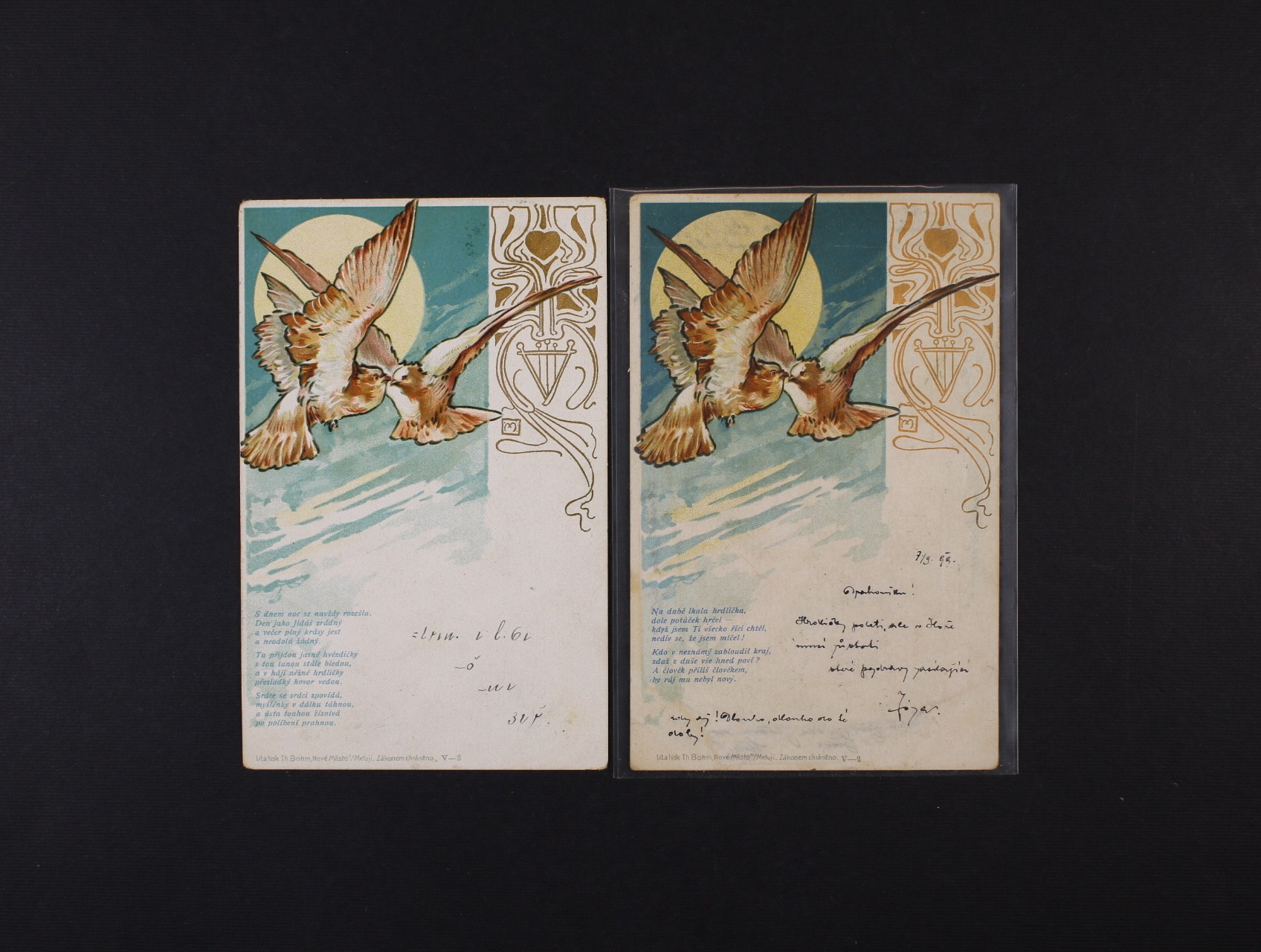 Umělecké - 2 secesní bar. litografie, emise Hálkovy Večerení písně s námětem holubice, sign. Muttich, dl. adresy, použité 1899