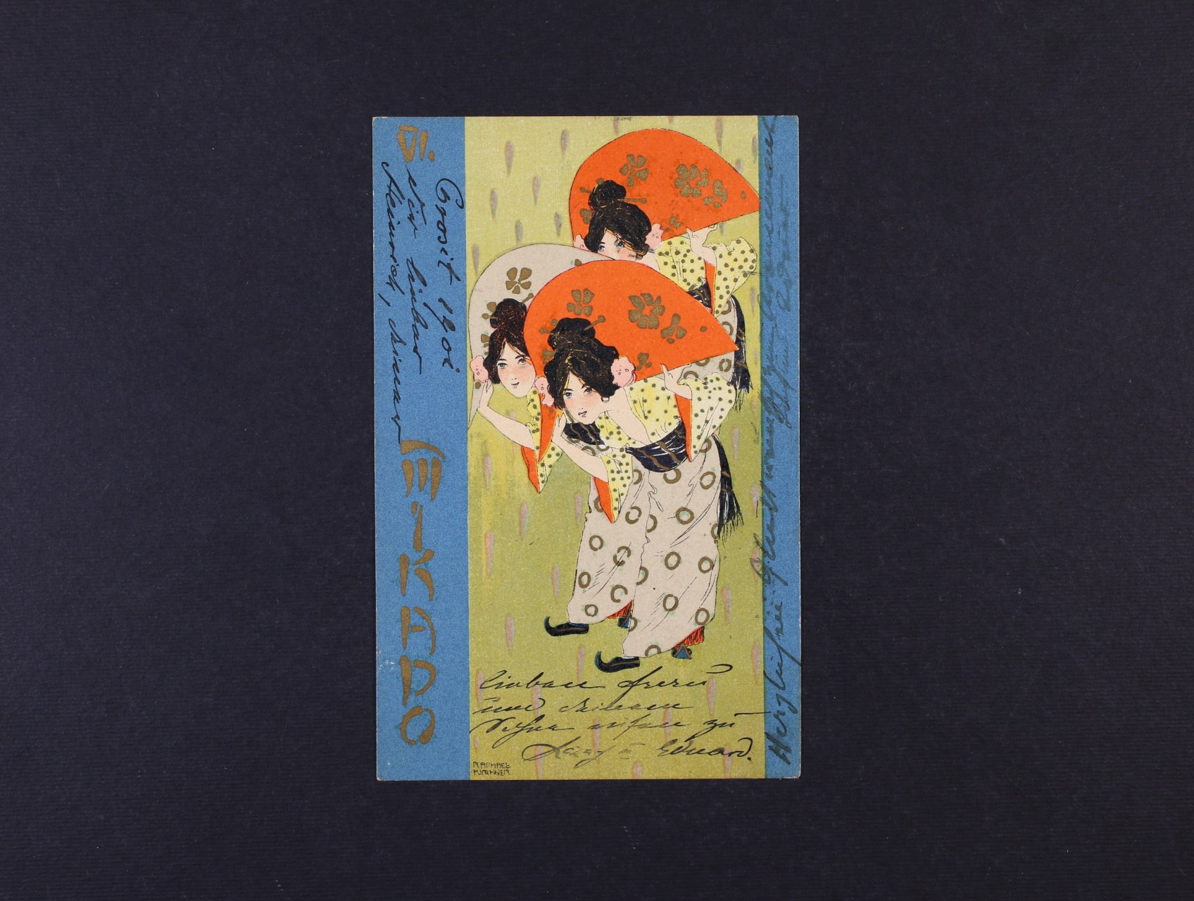 Umělecké - bar. litografie "Mikádo", sign. R. Kirchner, dl. adresa, použitá 1900