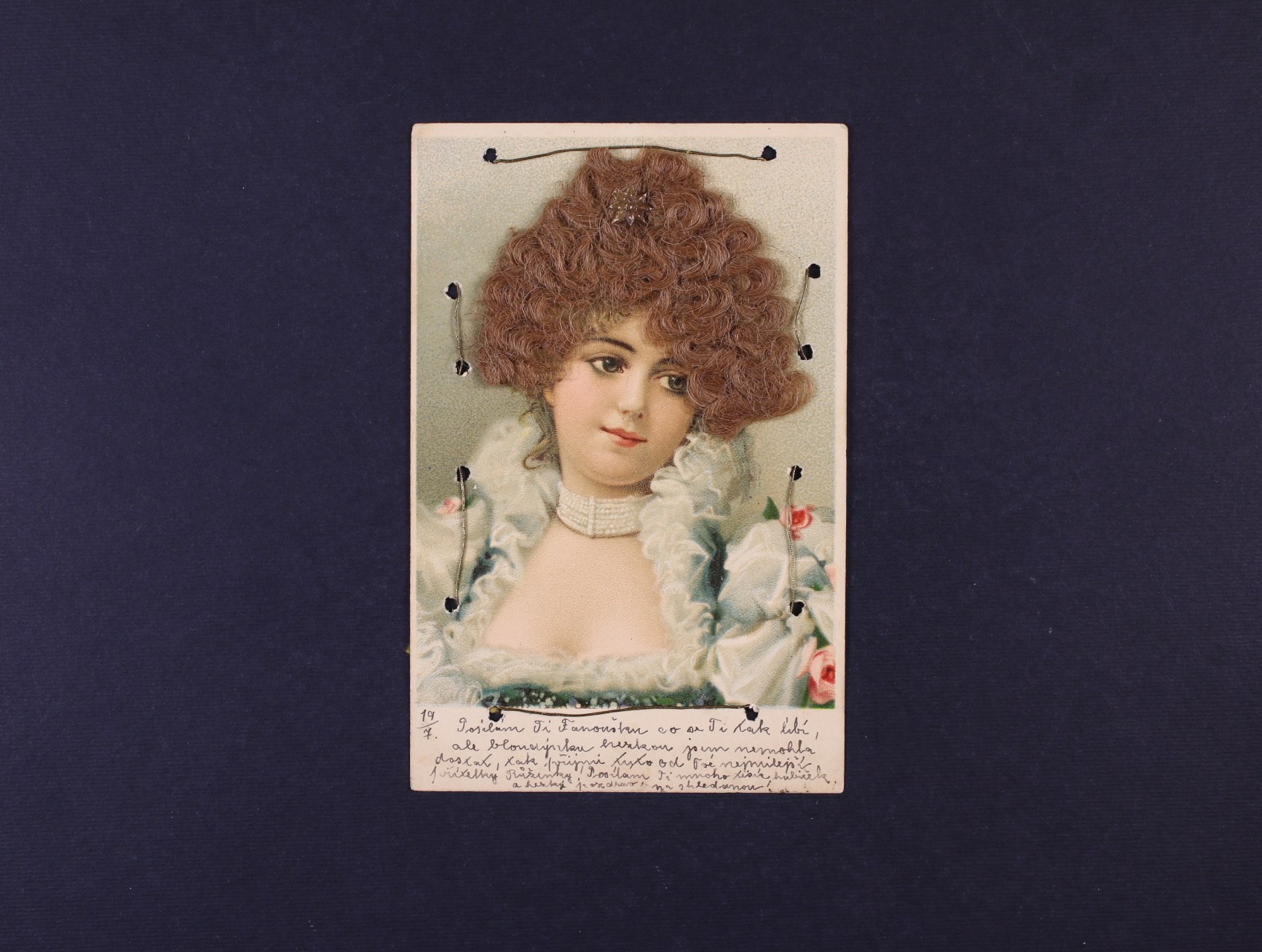 Umělecké - bar. litografie s námětem dívky s dolepenými vlasy, dl. adresa, použitá kolem r. 1900