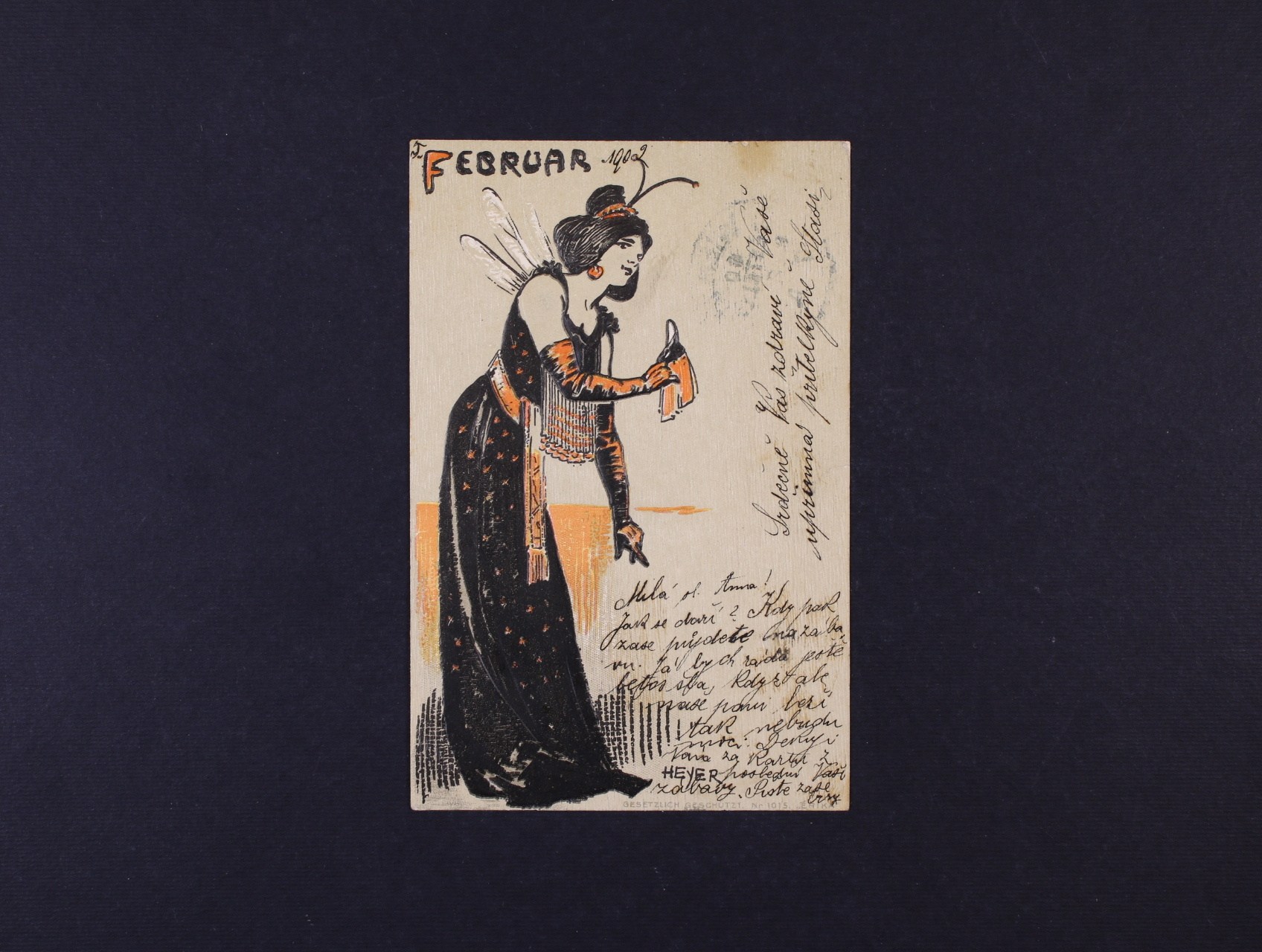 Umělecké - bar. reliéfní litografie ze série měsíce FEBRUAR Dáma v róbě, sign. Heyer, dl. adresa, použitá