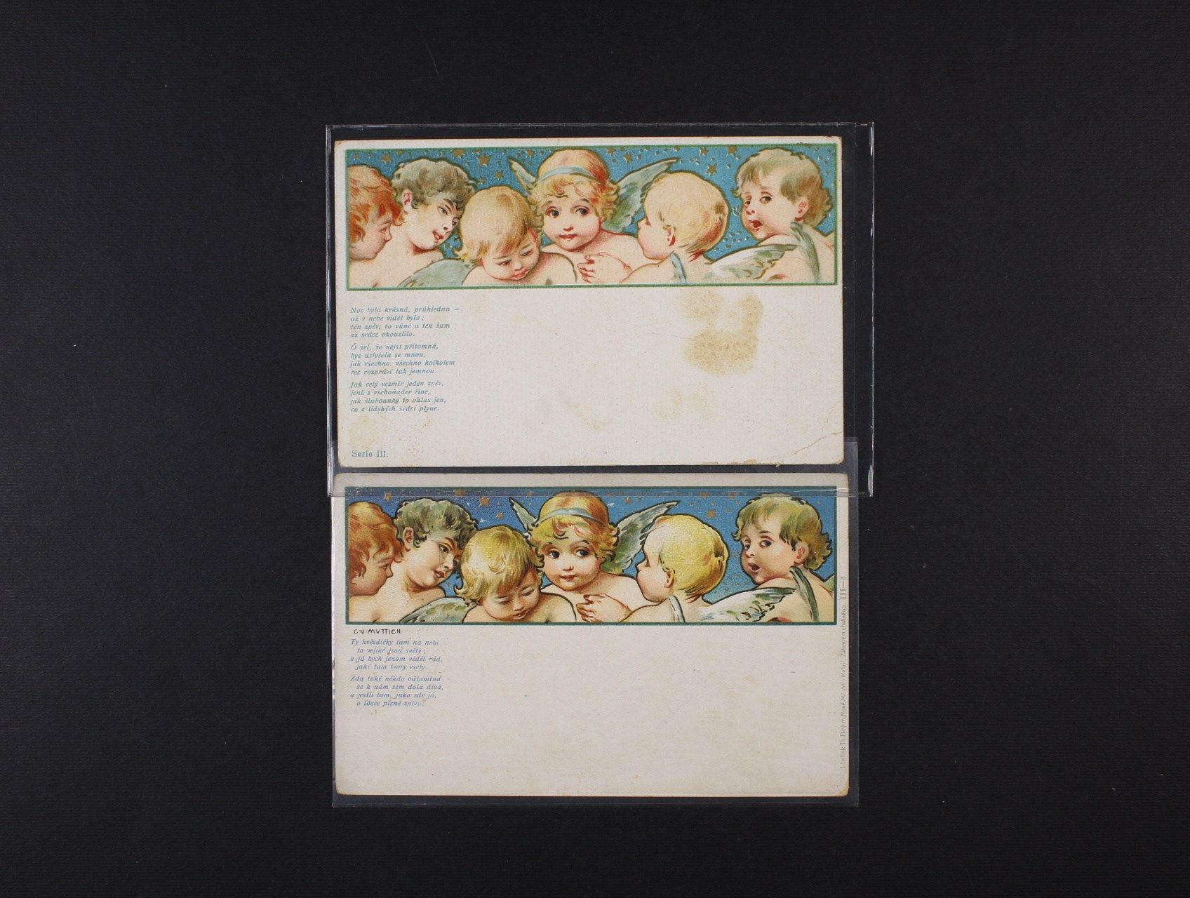 Umělecké - dvě secesní bar. litografie , emise Hálkovy Večerní písně s námětem andílci, 1x se sign. Muttich, rozdílné texty,