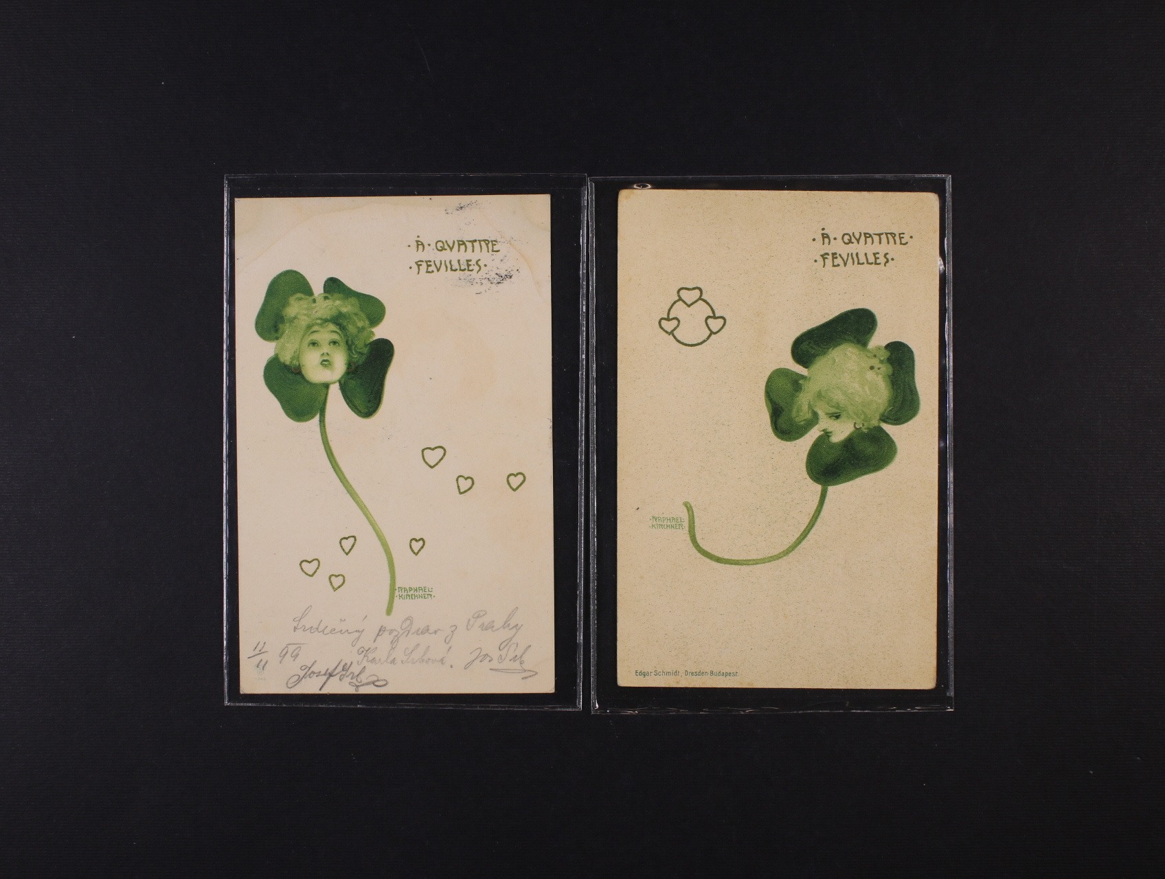 Umělecké - dvě secesní bar. litografie s námětem čtyřlístek, sign. R. Kirchner, dl. adresy, nepoužité