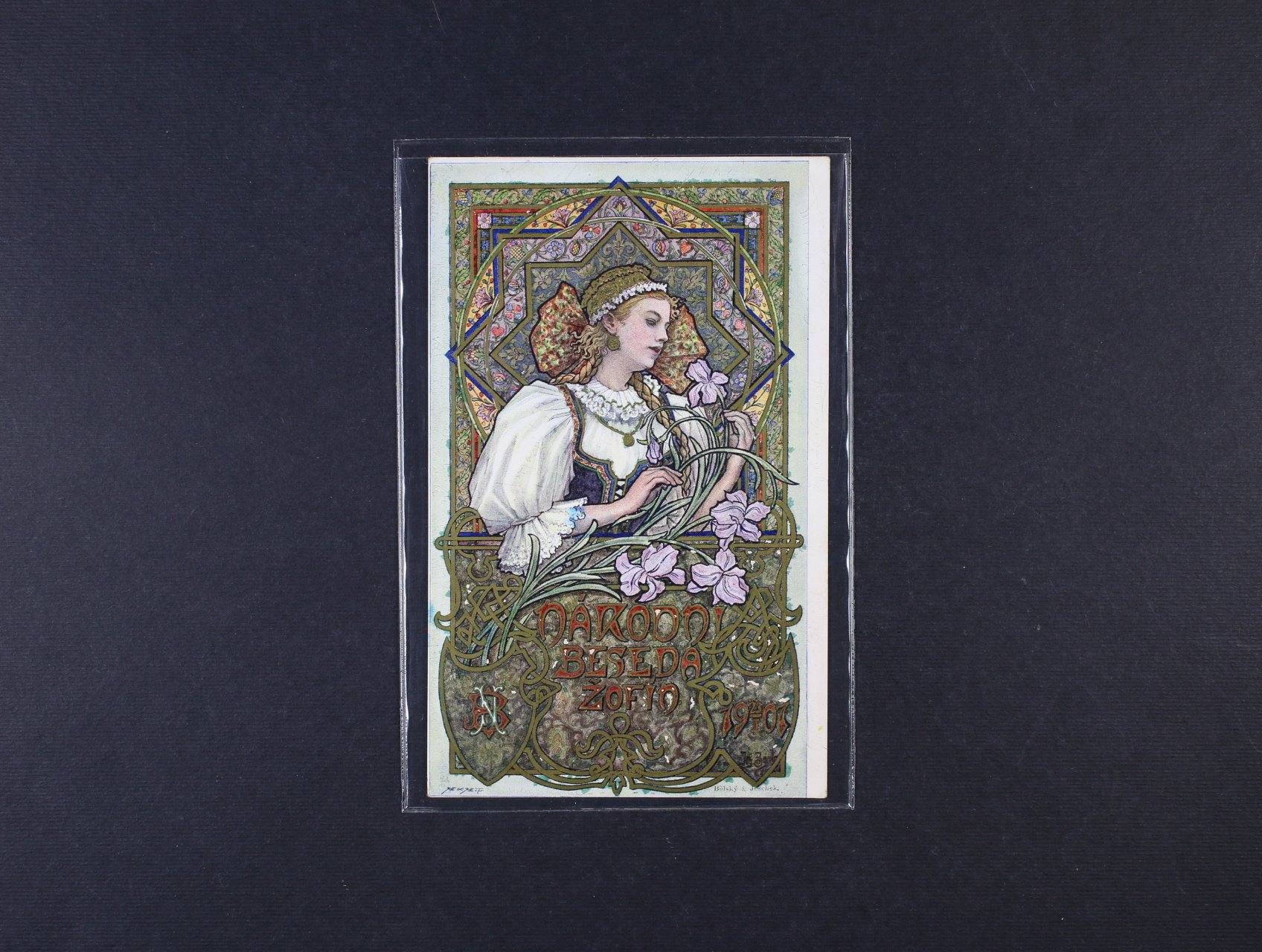 Umělecké - bar. secesní litografie emise Hálkovy písně s námětem Dívka s květinou, sign. Muttich, dl. adresa, použitá 1899