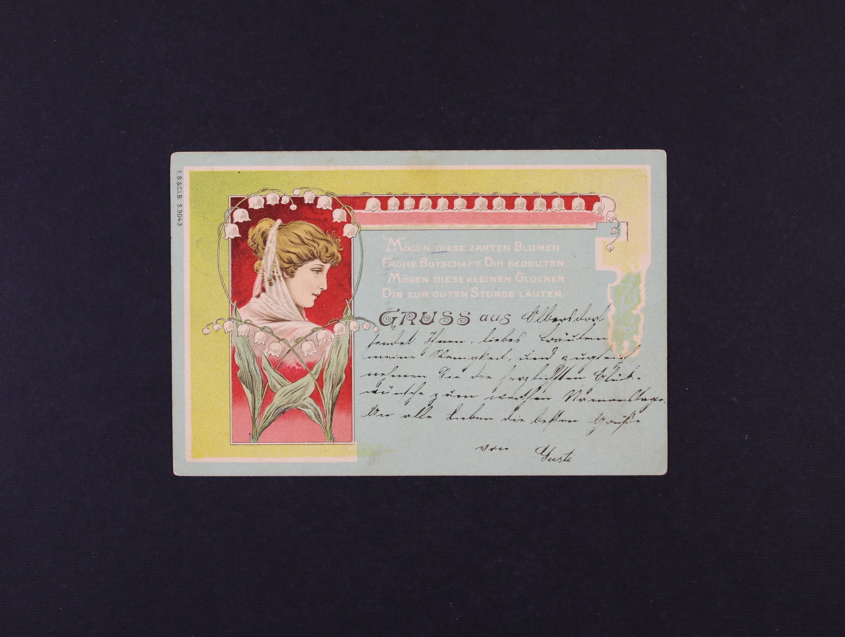 Umělecké - secesní bar. litograf. koláž "Dívka s květinami", dl. adresa, použitá 1899