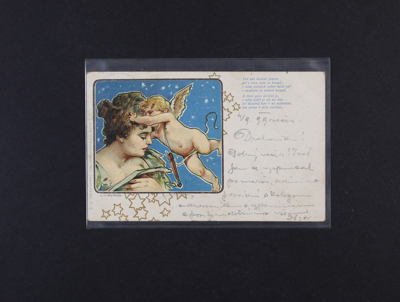Umělecké - secesní bar. litograf. koláž, emise Hálkovy Večerní písně s námětem Dívka s andílkem, dl. adresa, použitá 1899