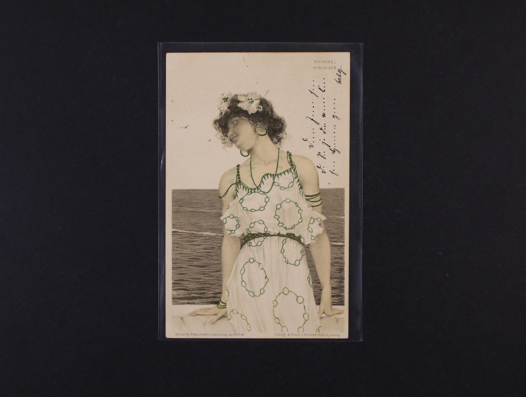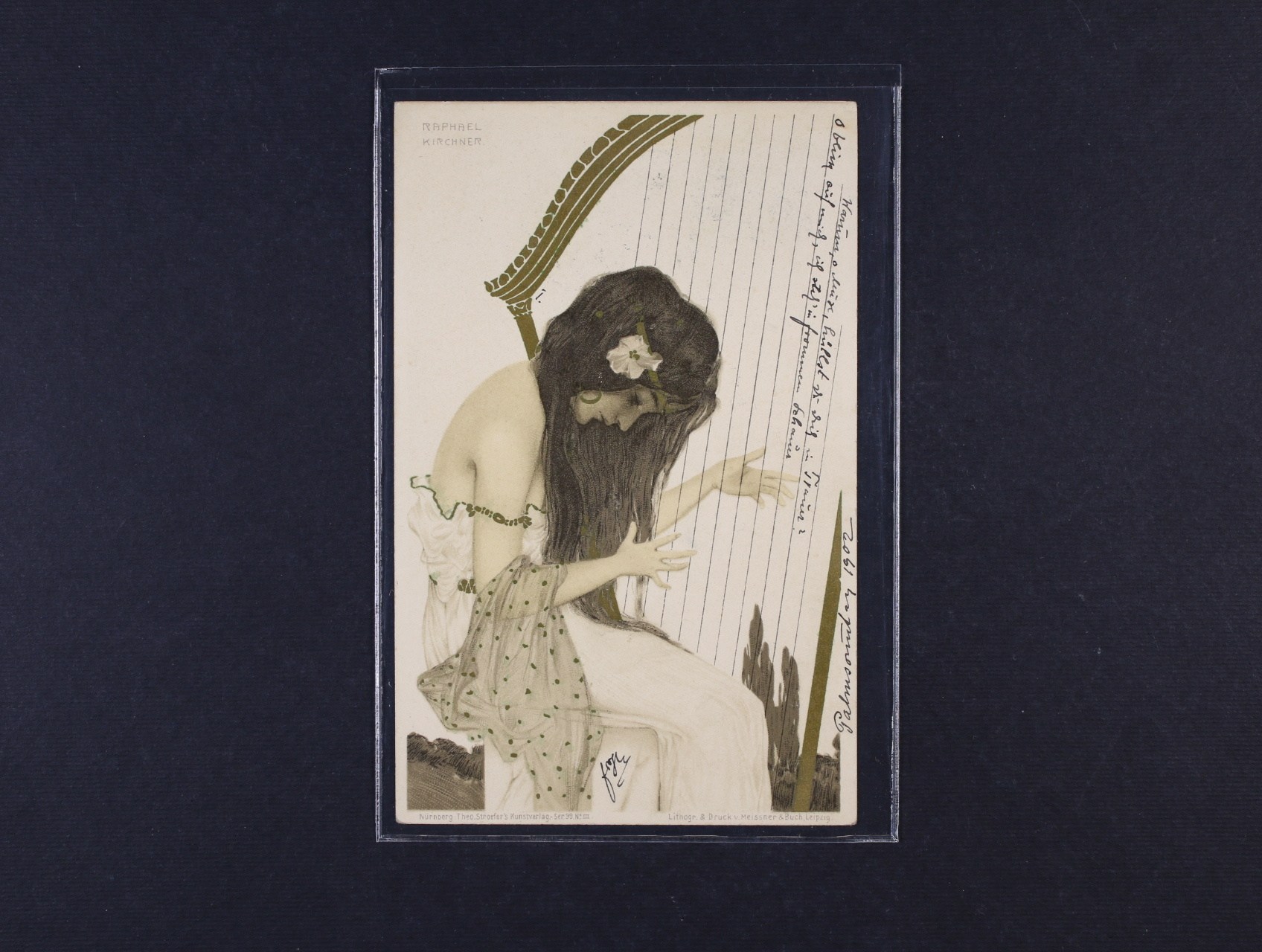 Umělecké - secesní bar. litografie Dívka s harfou, sign. R. Kirchner, dl. adresa, použitá 1902