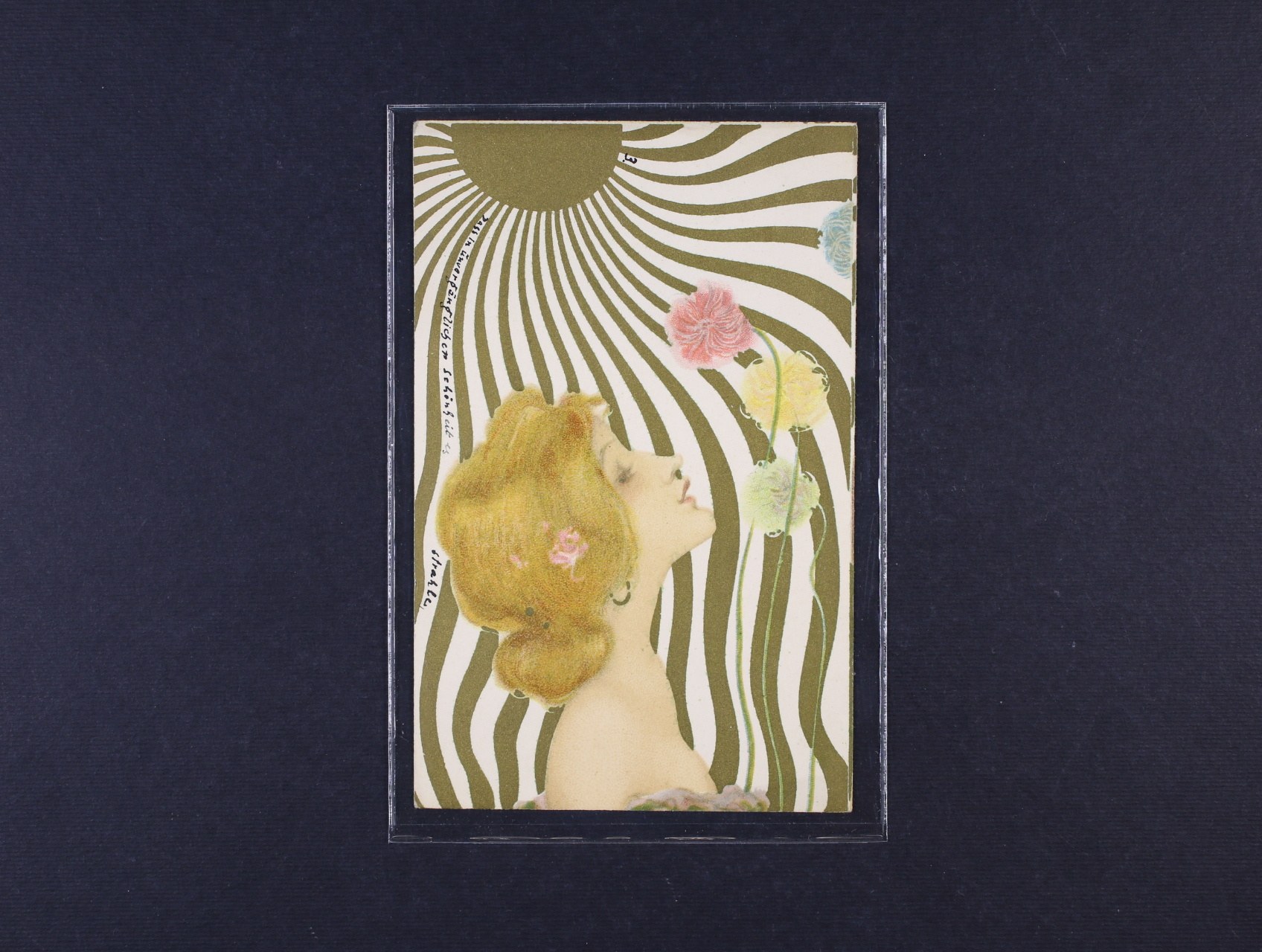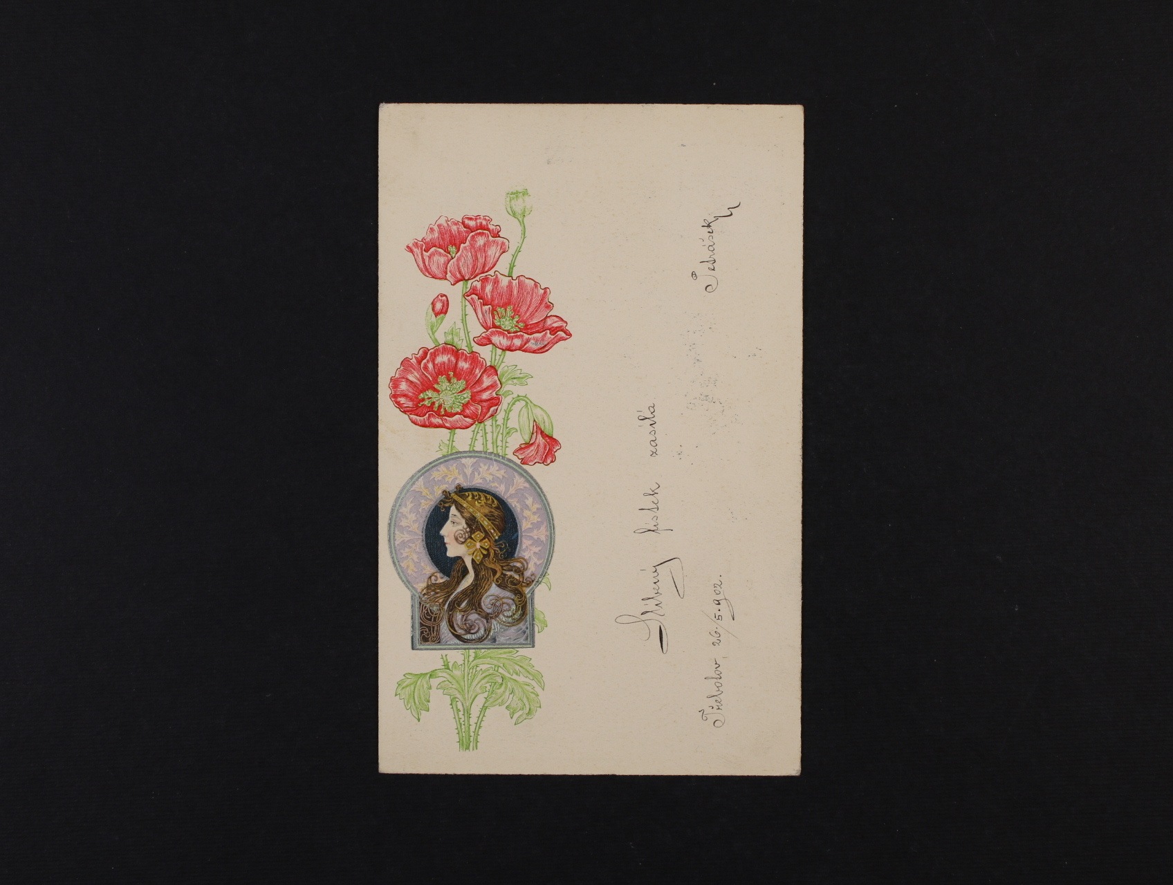 Umělecké - secesní reliéfní bar. litografie "Dívka s vlčími máky", dl. adresa, použitá 1902