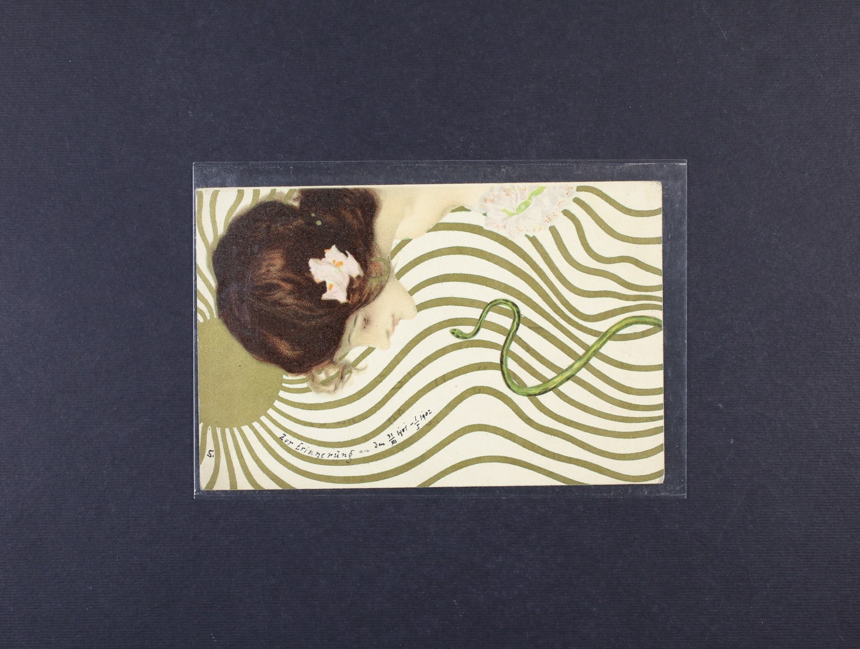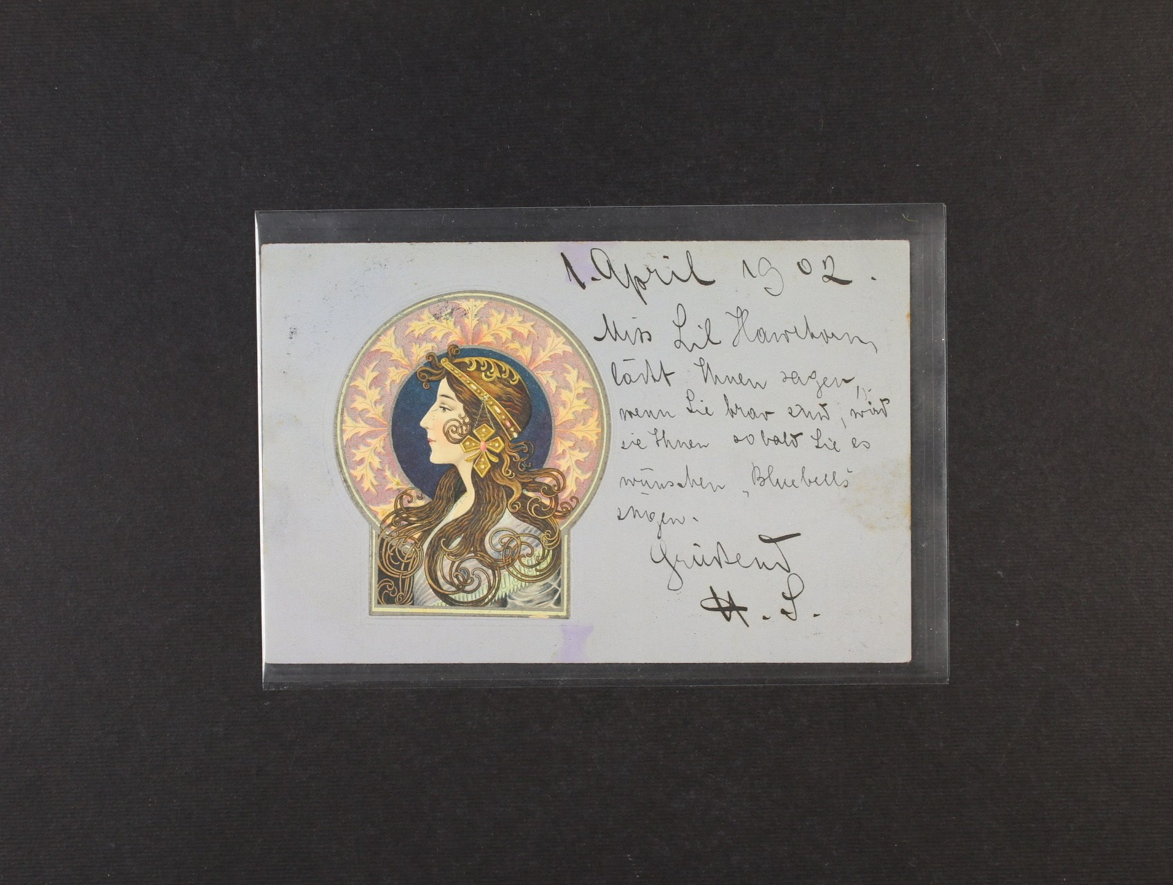 Umělecké - secesní bar. reliéfní litografie dívka s dekorativním účesem (Německo), dl. adresa, použitá 1902