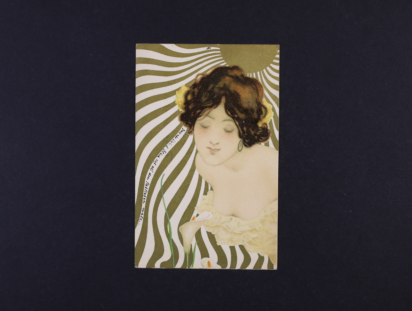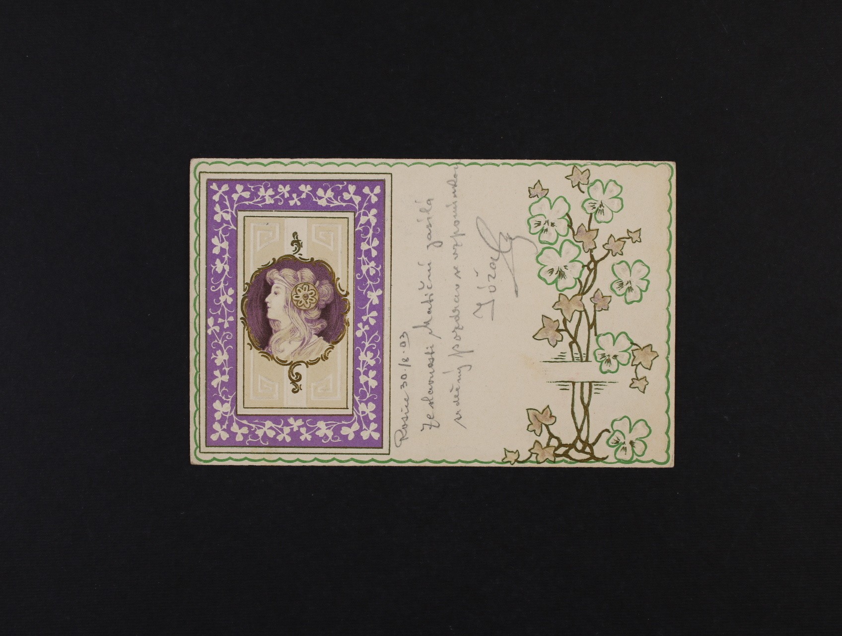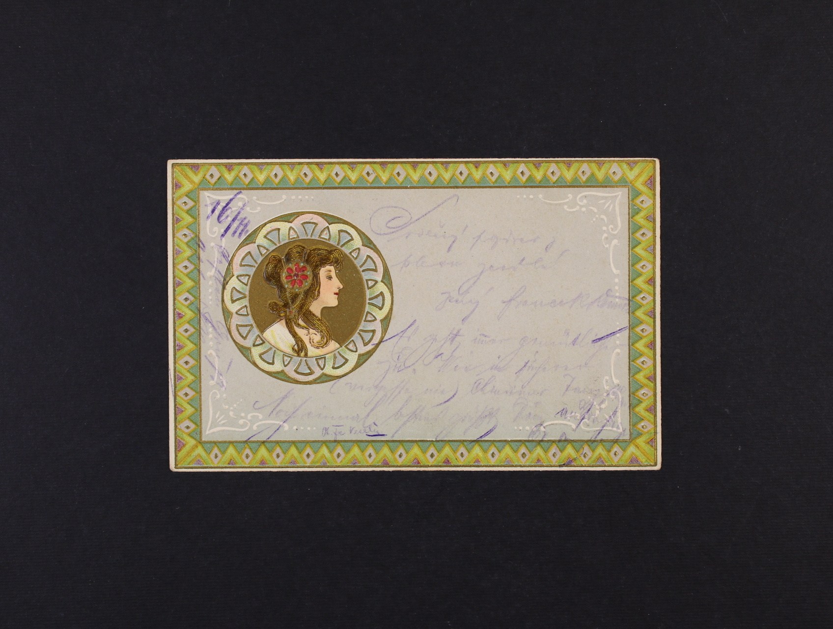 Umělecké - secesní bar. reliéfní litograf. koláž dívka z profilu, dl. adresa, použitá 1902