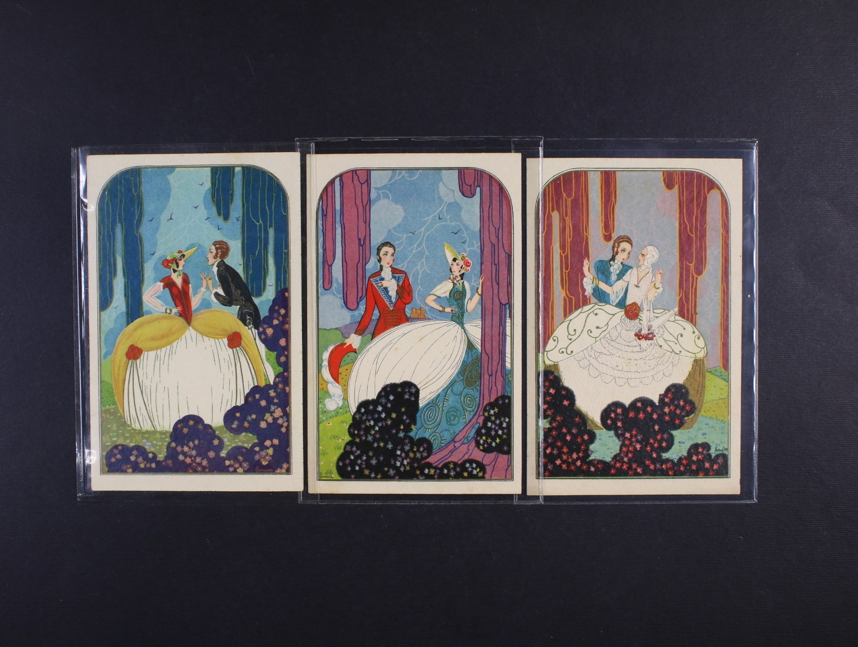 Umělecké - sestava 3 ks bar. pohlednic s námětem tanečnice, sign. Leonem (Francie), nepoužité