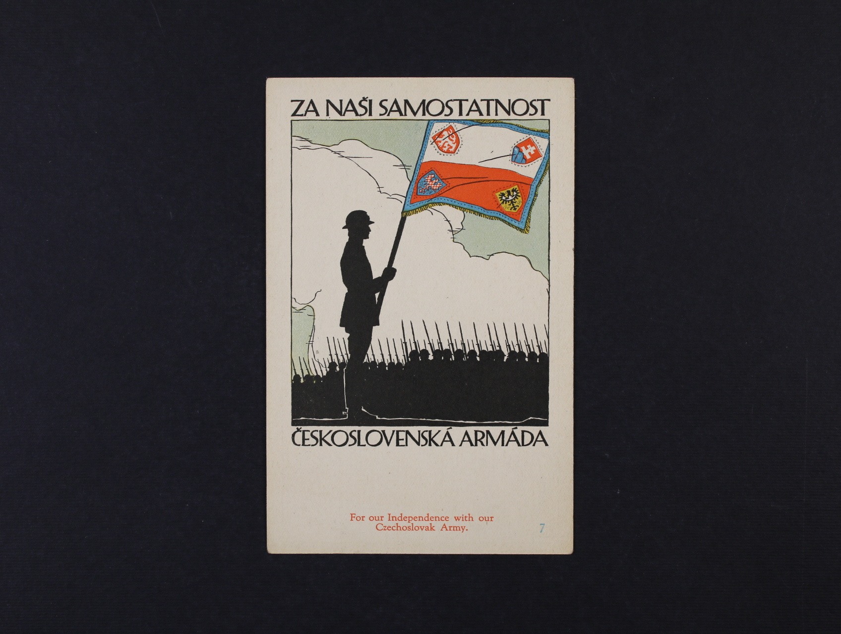 Vojenské - barevná náborová pohlednice "ZA NAŠI SAMOSTATNOST ČESKOSLOVENSKÁ ARMÁDA" vydaná v USA pro nábor čs. legionářů, nepoužitá, v levém spodním rožku lehký lom