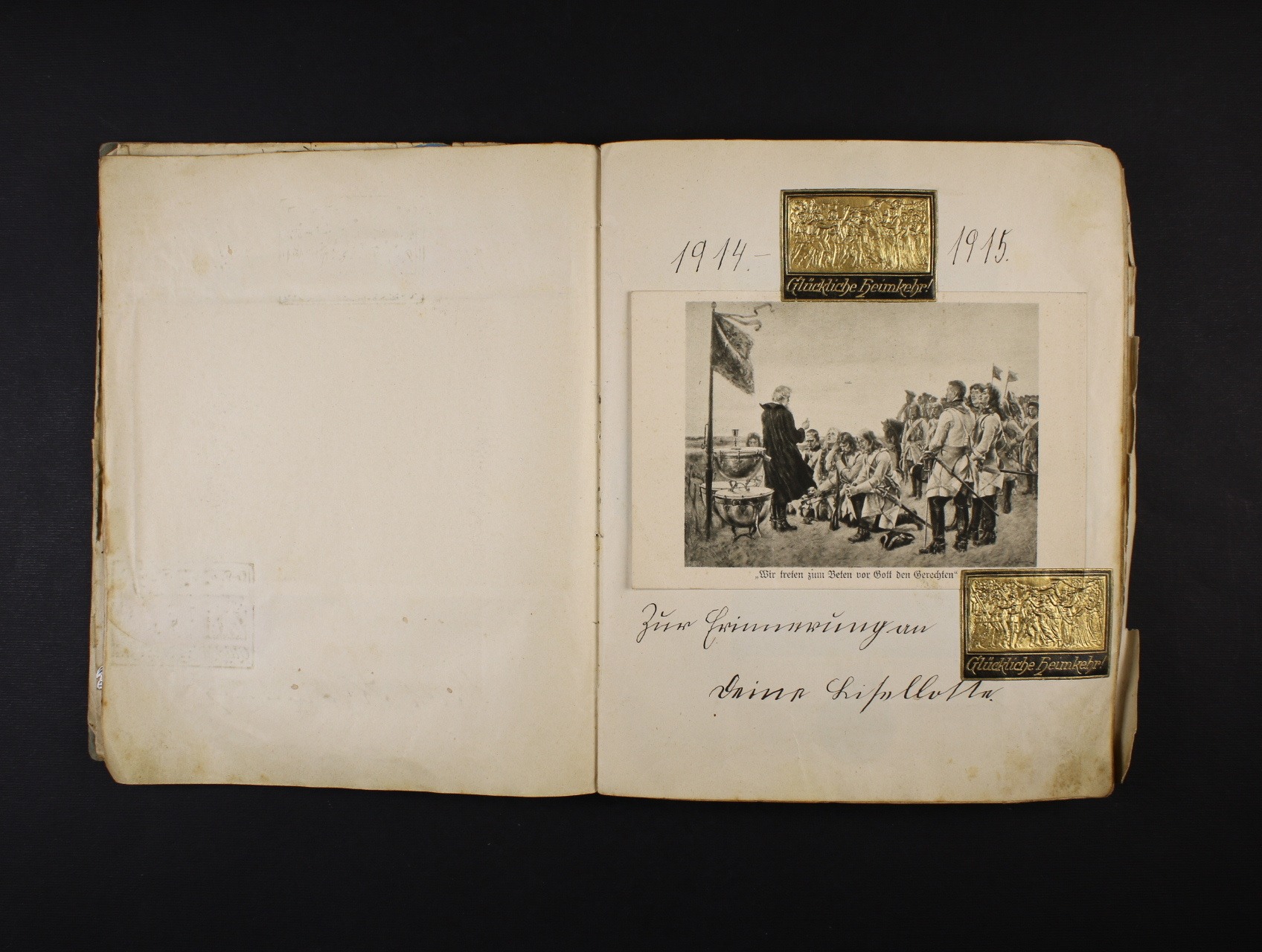 Vojenské - památník z let 1914 - 1916 s vylepenými 52 ks bar. i jednobar. pohlednic s vojenskými náměty vč. portrétů císaře F.J. a nalepenými dobročinnými nálepkami doprovázenými věnováním a texty, zajímavý dobový doklad