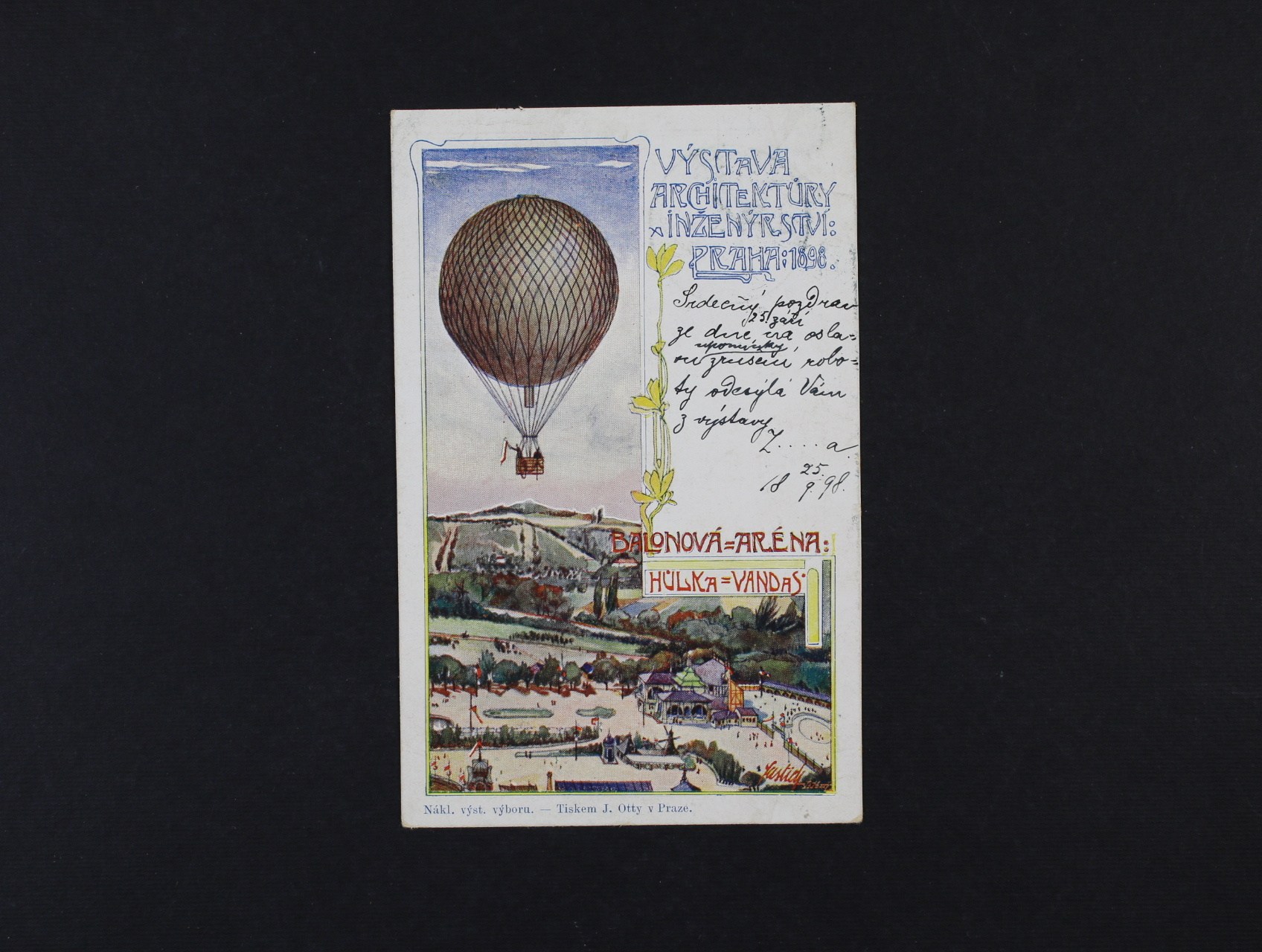 Výstavy - bar. koláž "Výstava architektury a inženýrství Praha 1898 balonová aréna" s dvojjazyčným raz. PRAHA VÝSTAVA 25.9.98, dobrá kvalita, zajímavé