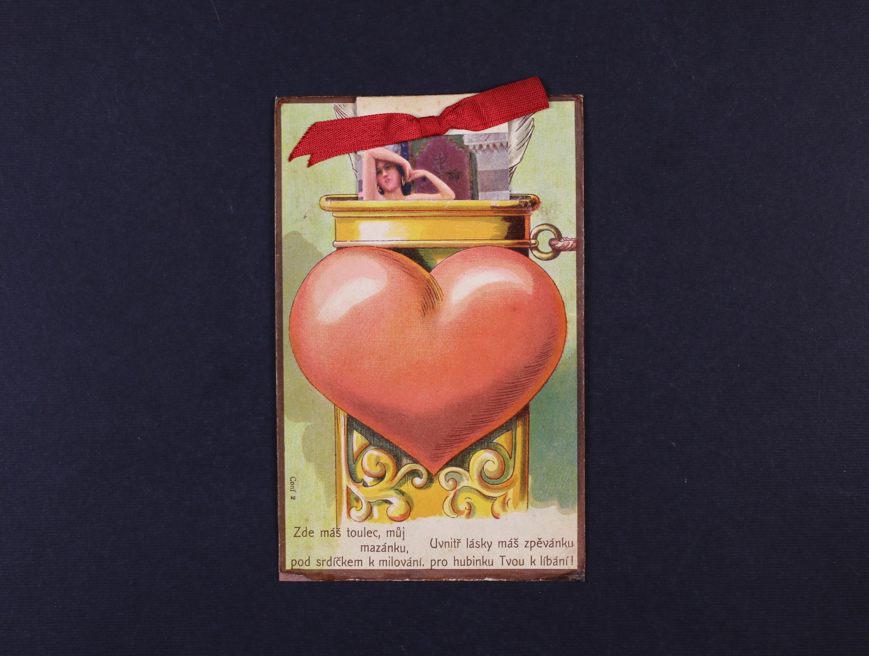 1141 Žertovné - bar. litografie s námětem srdce a vysouvacím obrázkem, dl. adresa, nepoužitá 300